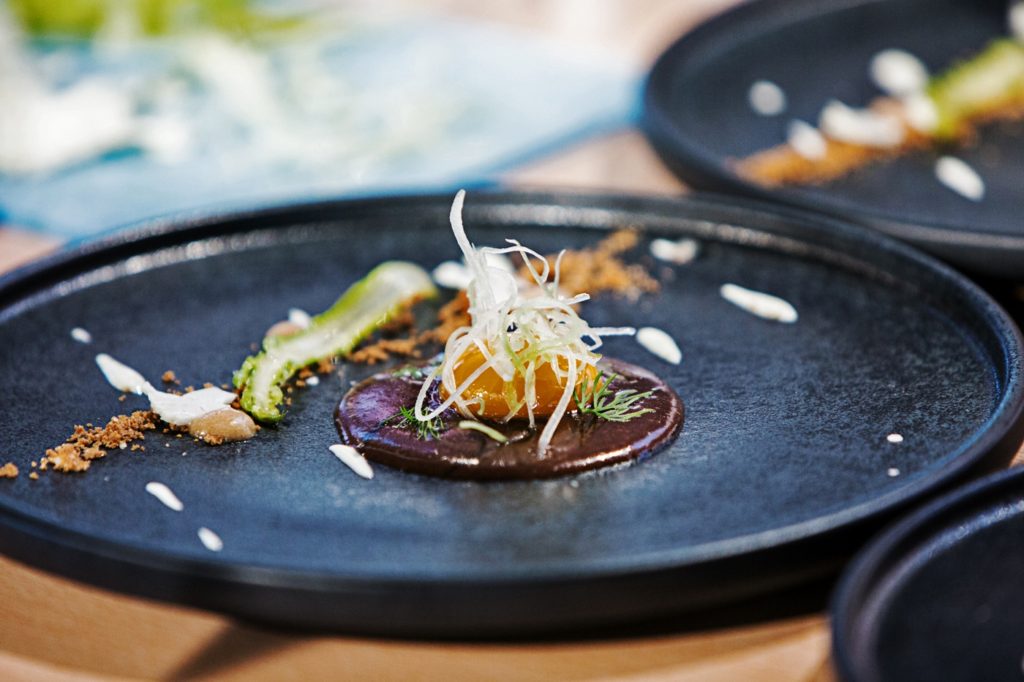 Plato libre “emulsión de morcilla conejera con yema confitada, gel de piña y gofio”