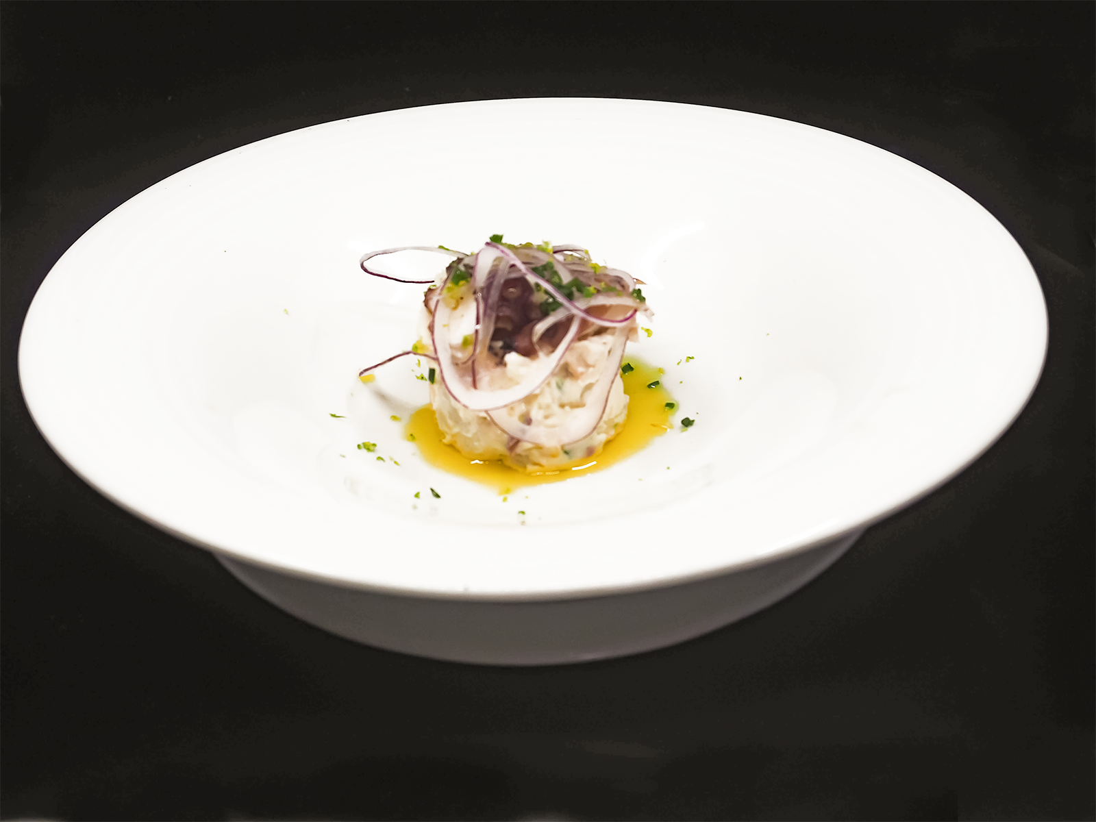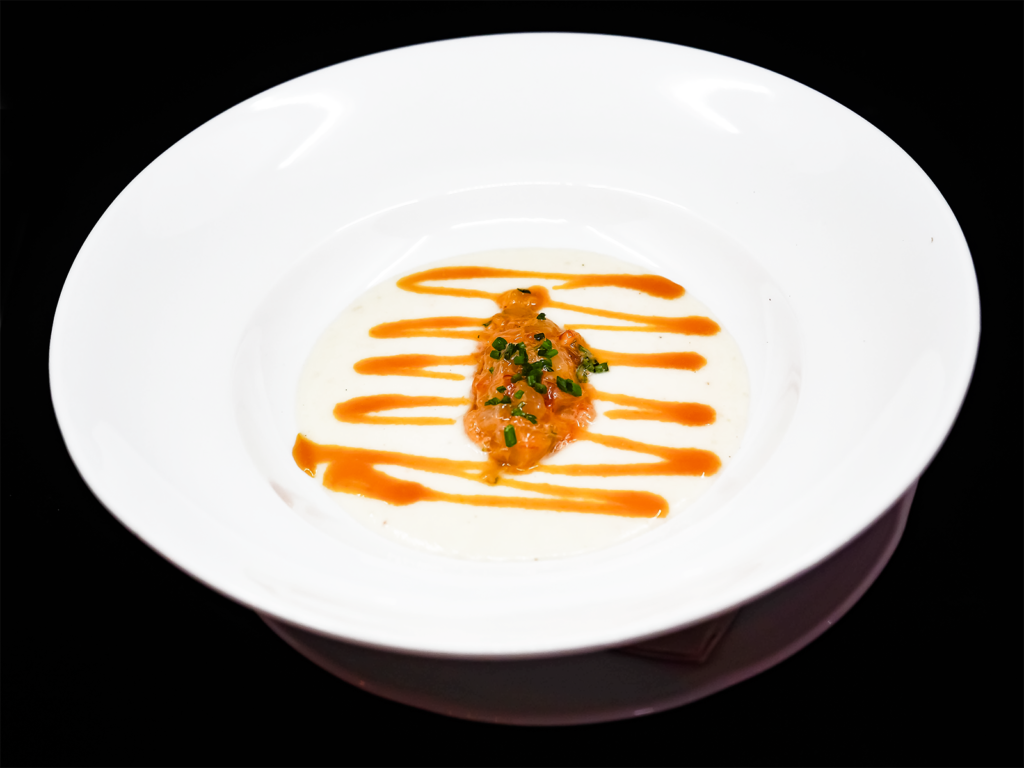 - Tartar de gambón con toque picante sobre vichyssoise de papa nueva.