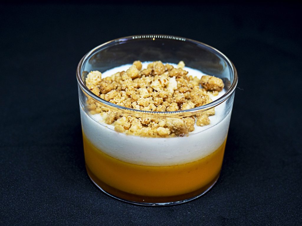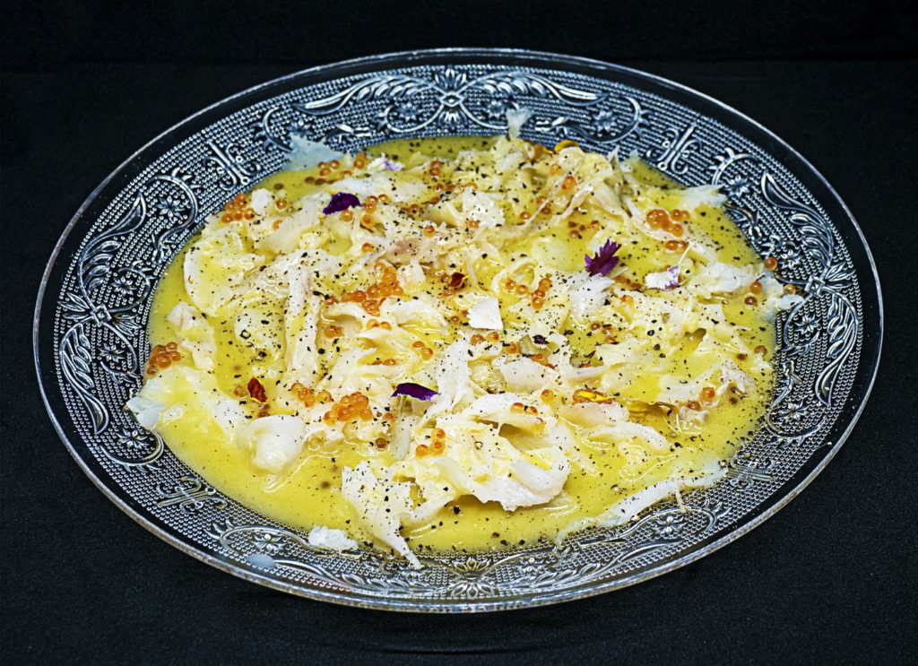 Tiradito de bacalao ahumado con esencia de maracuyá