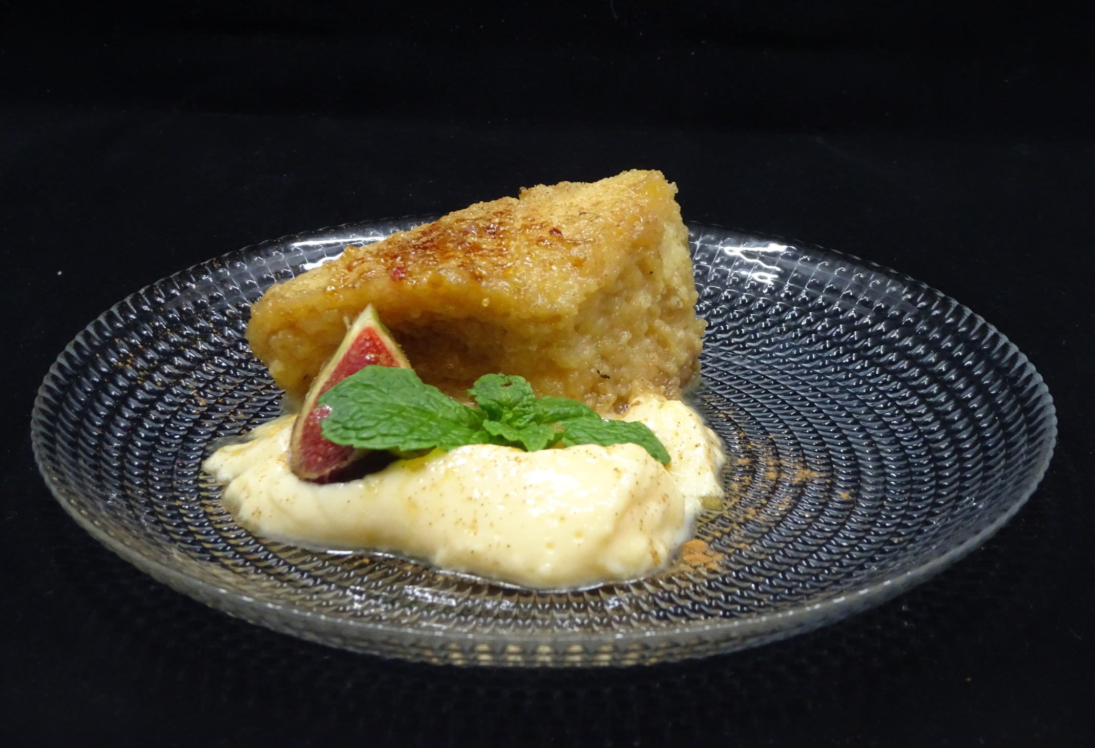 6. Postre: Torrija caramelizada de pan brioche con crema inglesa. Maridado con vino blanco “Diez Siglos” Verdejo, D.O. Rueda, y vino tinto “Berceo crianza 2019” D.O. Rioja. Se ofreció además agua, café o infusión.