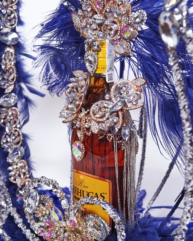 Para él el diseño de la botella de ron le inspira a recordar lo importante que es hoy en día una reunión entre amigos, el brindis de una boda, las campanadas de fin de año o simplemente un “mogollón“ de carnaval. Su creación está realizada con materiales reciclables buscando hacer hincapié en un claro mensaje de cuidar el planeta.