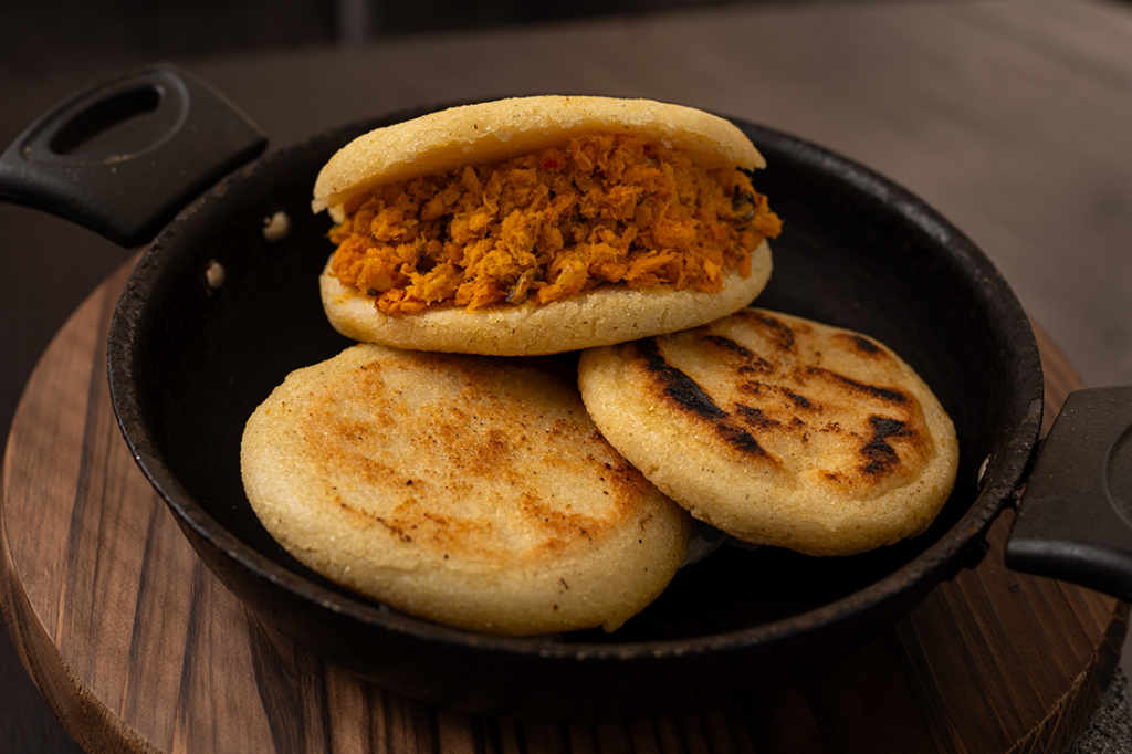 Mientras el guiso reposa, se prepara la masa. En España ya es fácil encontrar la harina de maíz precocida en cualquier mercado, pero el truco está en el reposo. Se mezcla con agua y sal, dejándola hidratar cinco minutos hasta que se sienta suave, como el lóbulo de una oreja. Se forman las bolas con las palmas, se aplastan con un cariño casi ritual hasta lograr el grosor de un dedo y se llevan a una plancha muy caliente. Cuando al darles un golpecito seco con los nudillos suenan a tambor, a hueco, es que el alma de la arepa está lista para ser liberada.