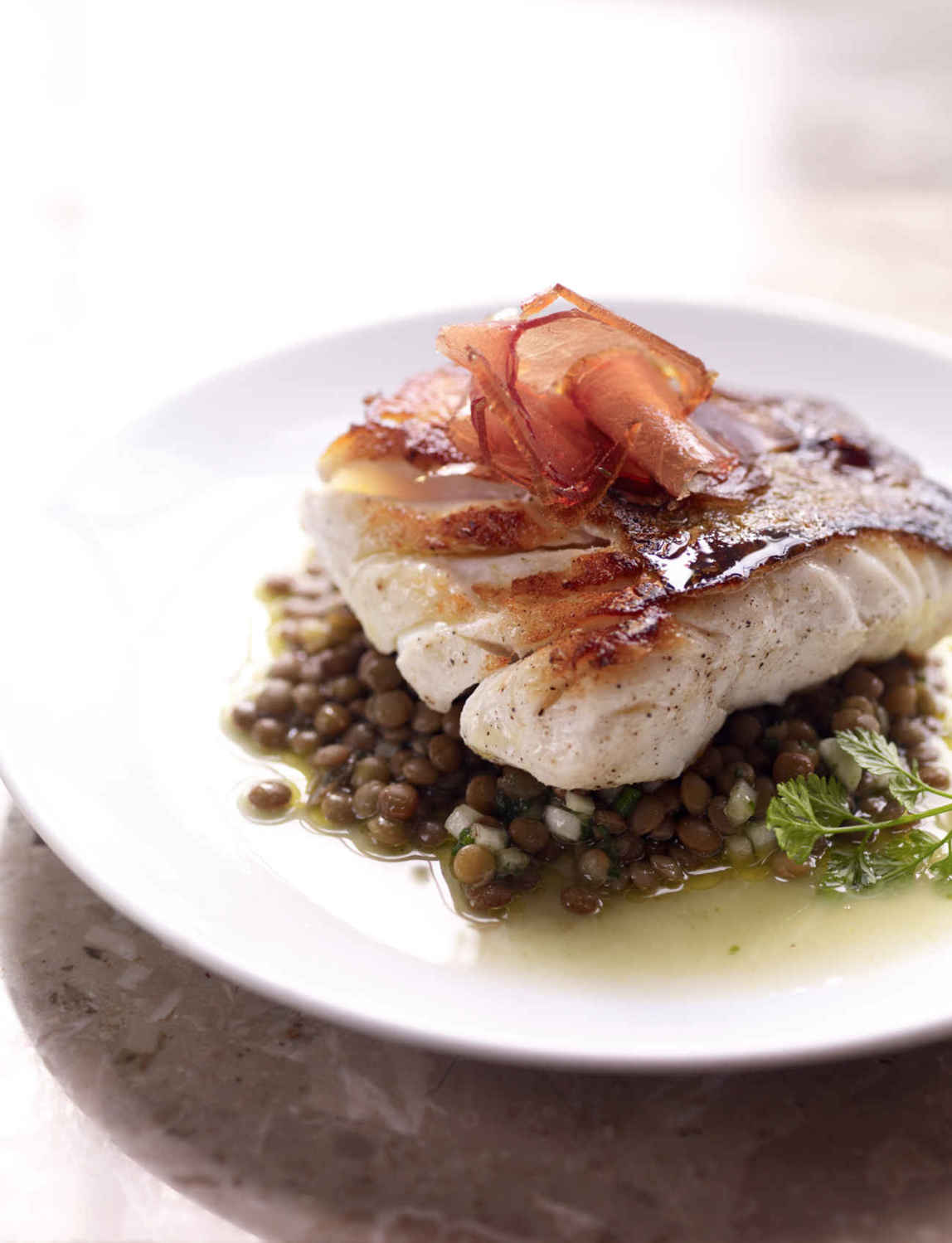 La terrosidad de las lentejas combina muy bien con el bacalao en este reconfortante plato invernal. Para una versión más veraniega, puedes servir las lentejas frías con un poco de zumo de limón. .