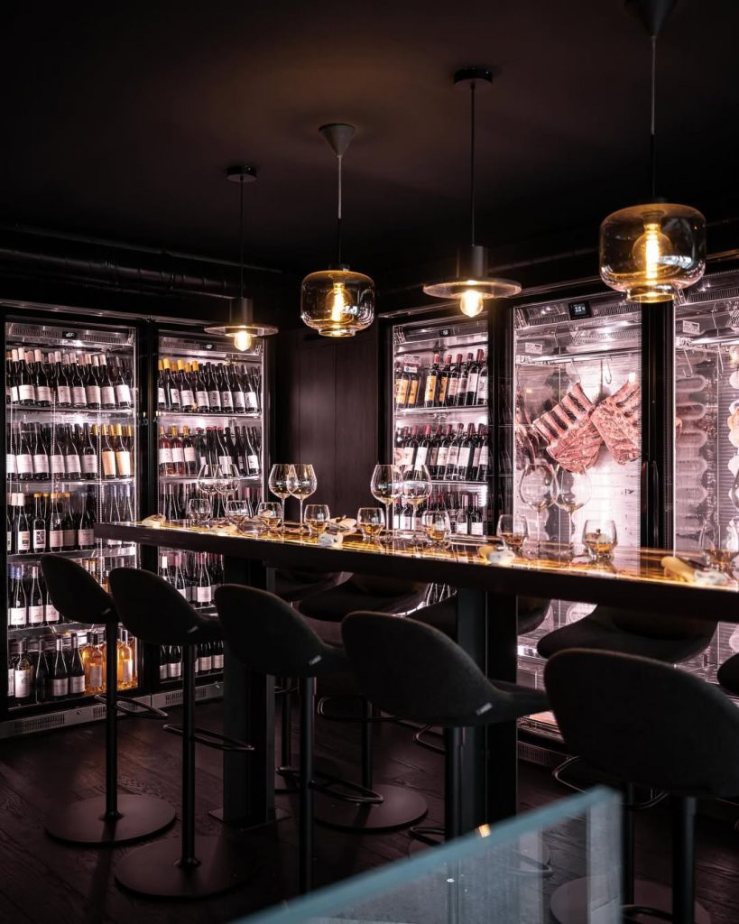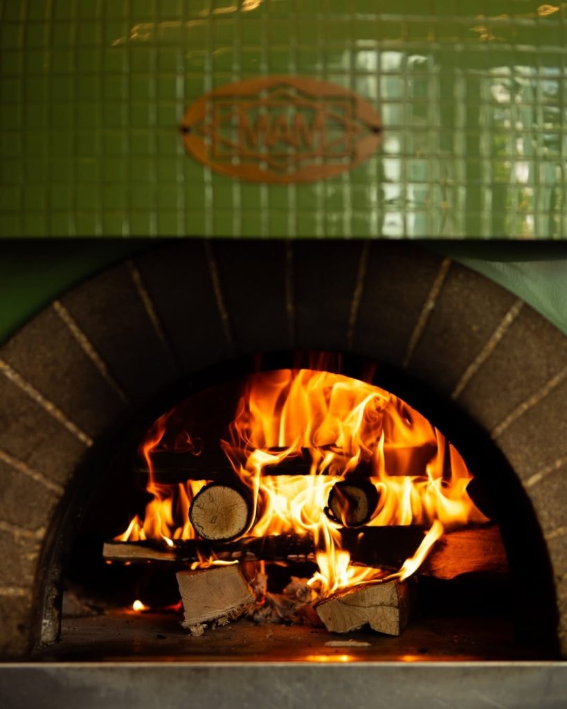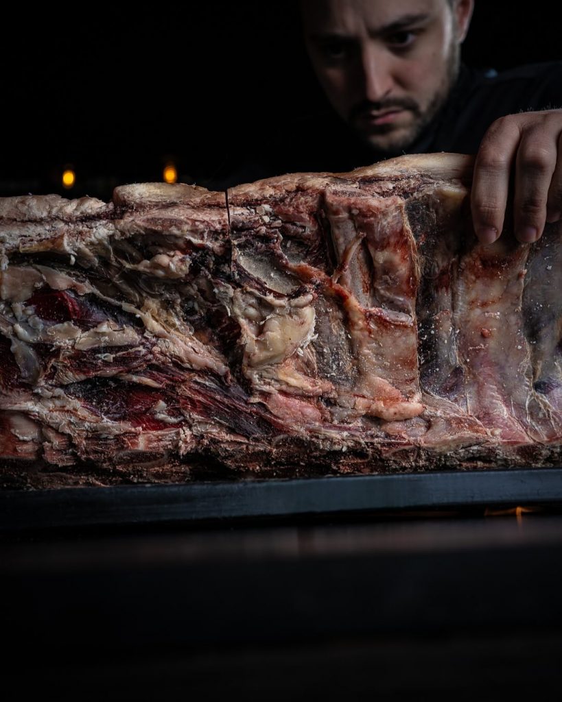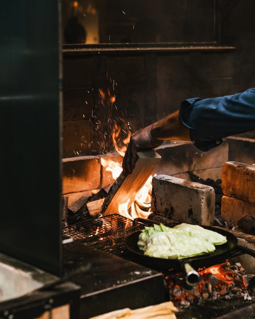 El espacio combina el espíritu industrial con la calidez del humo. Ladrillos oscuros, metal pulido y una luz ámbar que acaricia las superficies crean una atmósfera casi cinematográfica. Pero el verdadero espectáculo comienza al cruzar la puerta: una parrilla de cuatro toneladas y un horno de leña construido a medida dominan la sala. La cocina es abierta, sin fronteras, y los comensales se sientan frente a la acción, separados solo por una barra de madera. Desde allí se puede ver —y oír— cómo las llamas bailan, chispean y rugen mientras el equipo cocina con una precisión casi militar.