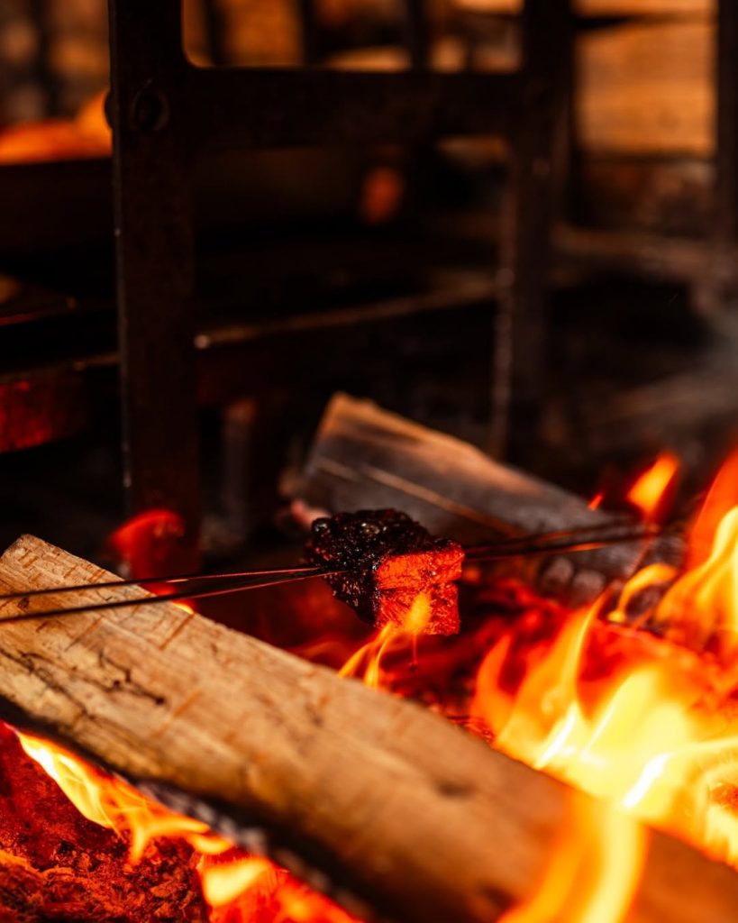 El calor se percibe antes de sentarse, el aire vibra con el olor a madera, y las brasas laten como un corazón a cielo abierto.