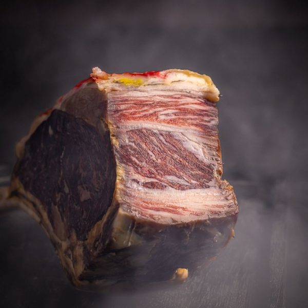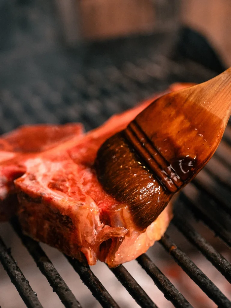 La carne es tierna, de un rojo intenso que brilla bajo la luz tenue del comedor. Cada corte parece respirado por el fuego, no marcado por él.