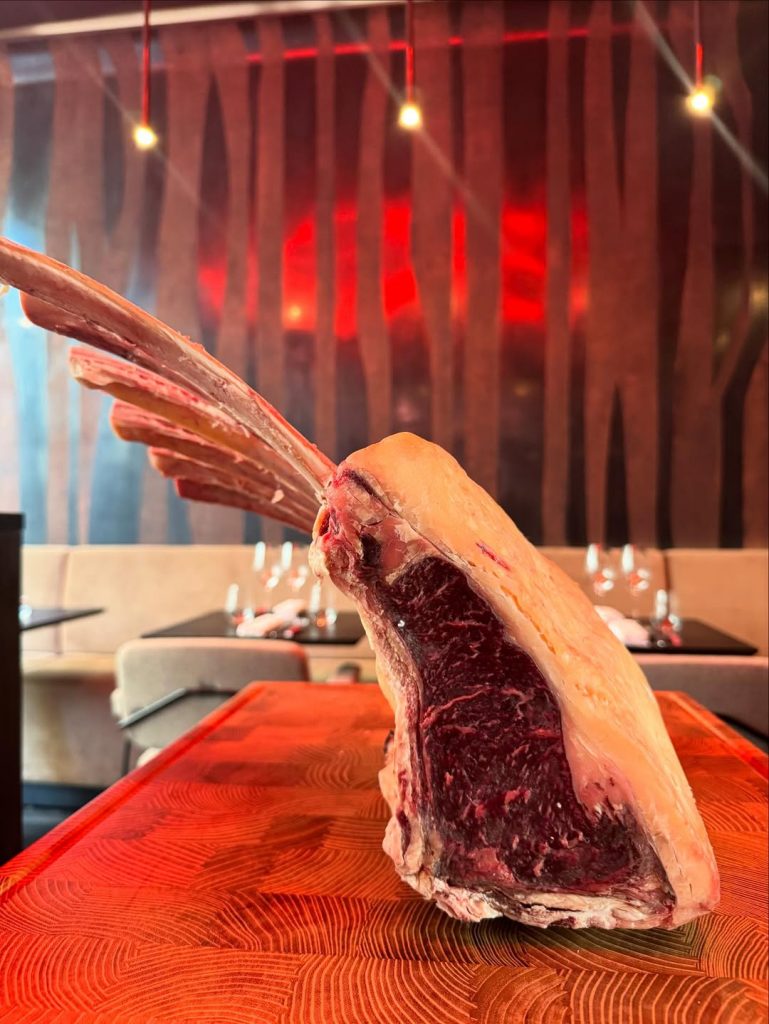 A primera vista, el espacio impacta por su sobriedad elegante. La parrilla central —un conjunto de acero forjado que brilla bajo una luz ámbar— domina la sala como un altar moderno. Las mesas, amplias y discretas, permiten observar la cocina abierta donde cada movimiento del equipo es medido, casi ritual. Aquí, el fuego no es un instrumento: es el eje sobre el que gira toda la experiencia.