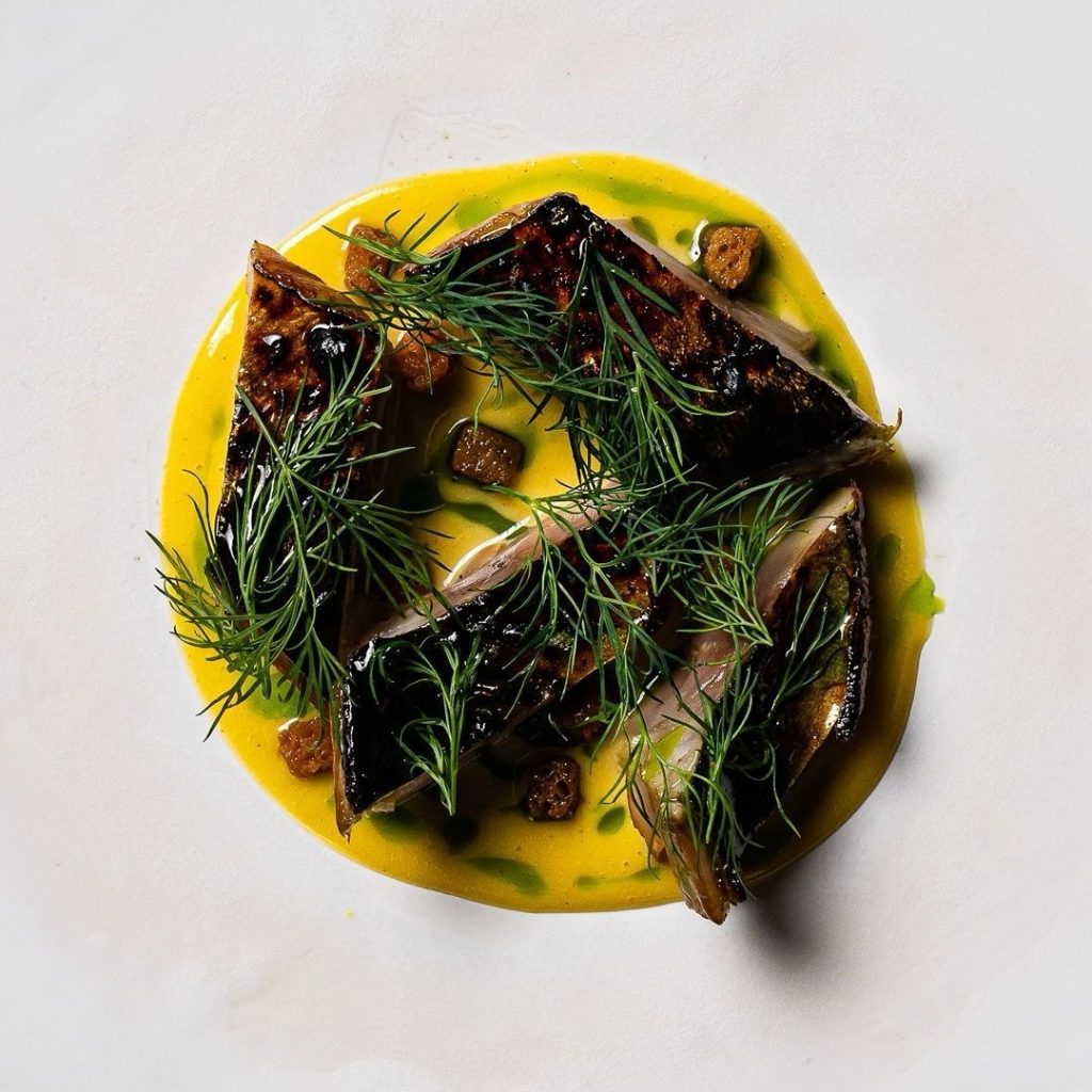 El menú degustación cambia con las estaciones, pero conserva una coherencia estética admirable. El pan con mantequilla ahumada abre la experiencia, con un sabor que se queda grabado en la memoria. Luego llega el plato que resume la esencia australiana de Hastie: el filete de canguro a la brasa, un corte magro y tierno, de sabor profundo, que se cocina apenas unos segundos sobre las brasas para conservar su jugosidad natural. El resultado es sorprendente: carne roja y suave, perfumada por el humo, servida con un toque de sal marina y aceite de eucalipto que realza su carácter salvaje.