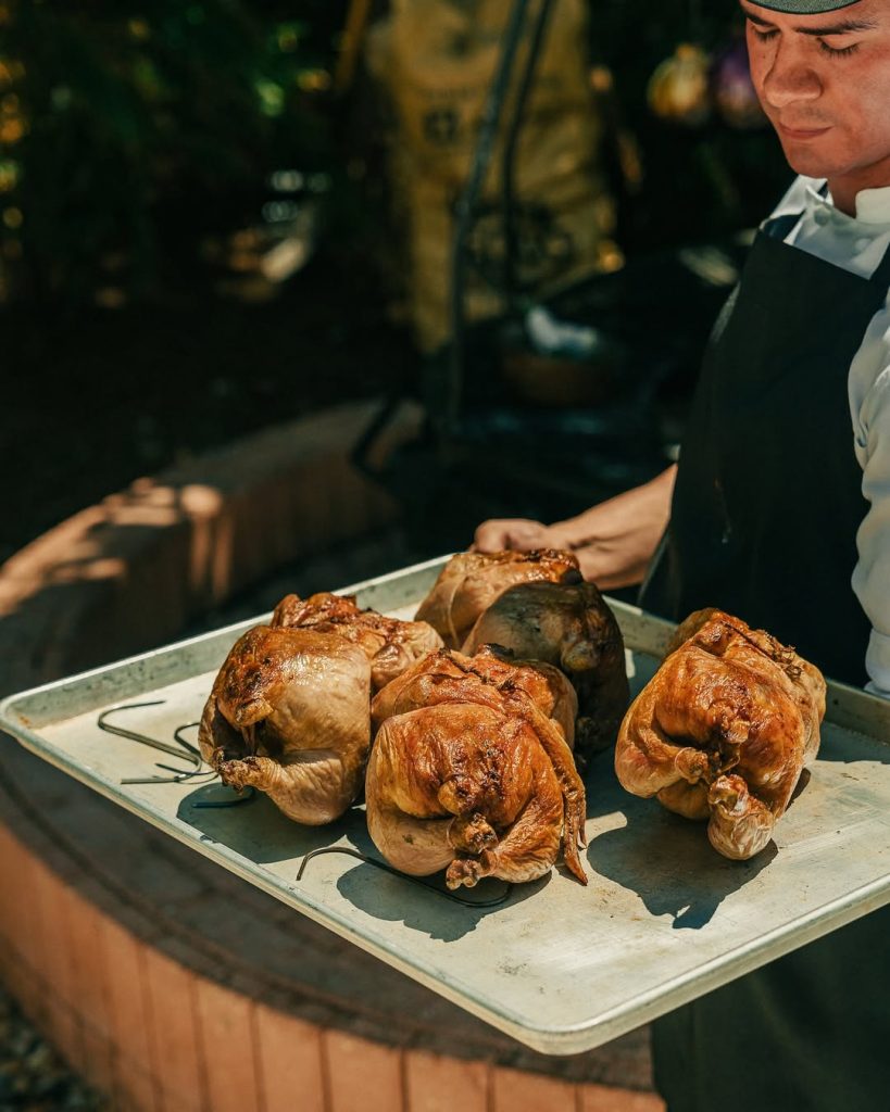 El menú es una conversación constante entre el fuego y la tierra. Cada plato parece una pieza de equilibrio: el pollo a la parrilla con puré de apio y hojas de mostaza, el pescado blanco cocinado sobre ceniza de olivo, o las verduras del huerto asadas lentamente sobre carbón vegetal, hasta alcanzar una textura que roza la perfección.