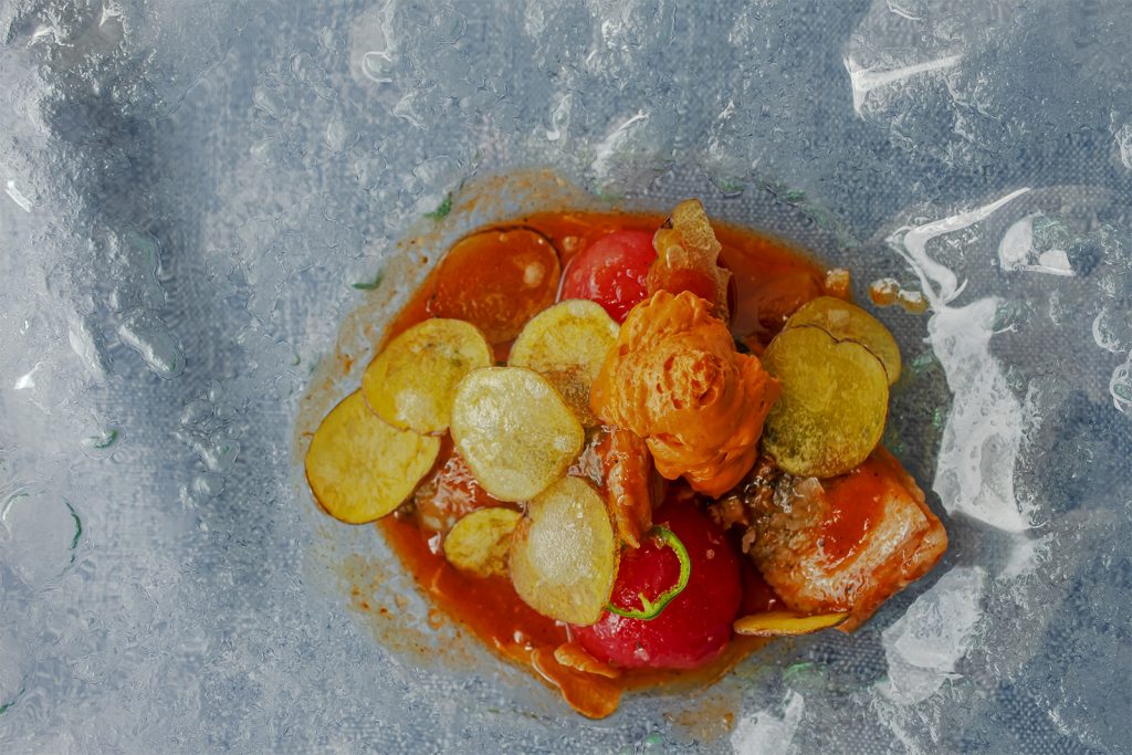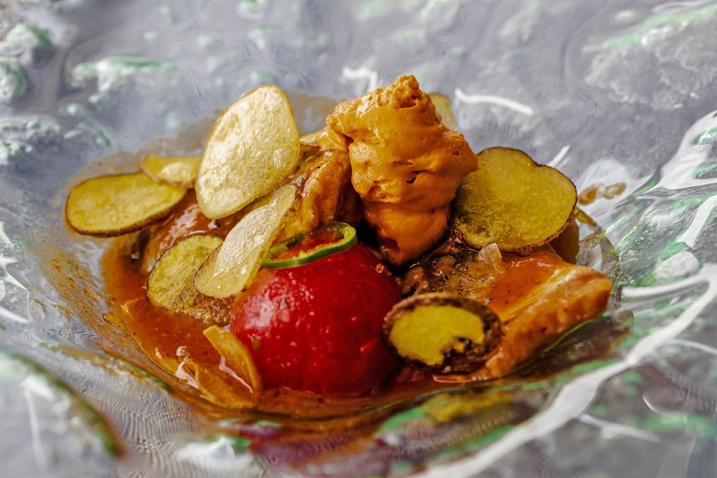 La elección de la papa negra canaria como acompañante es acertada en lo conceptual, una declaración de identidad local frente al exotismo de la anguila y el chipotle. Sin embargo, en su formato de chips, no alcanzaron la textura esperada: algo duras, nada crocantes y menos aun cuando el conjunto empieza a humedecerlas. Quizá una versión de papa suflada habría potenciado ese elemento crujiente tan necesario para equilibrar el bocado.