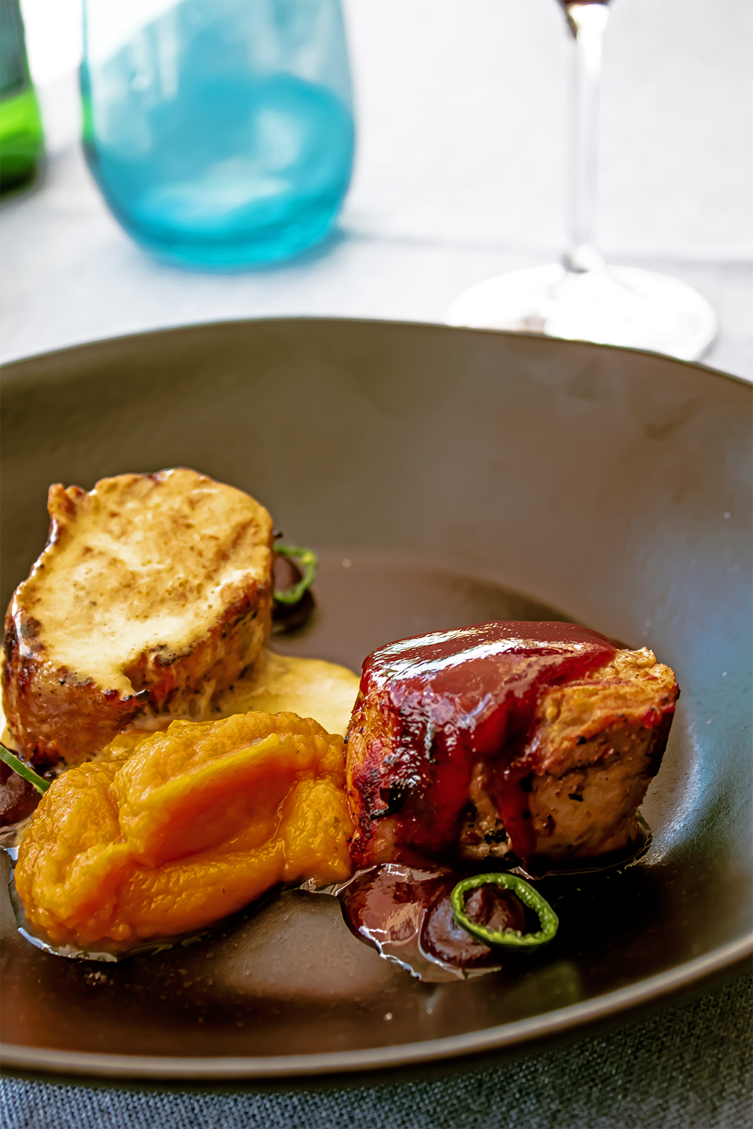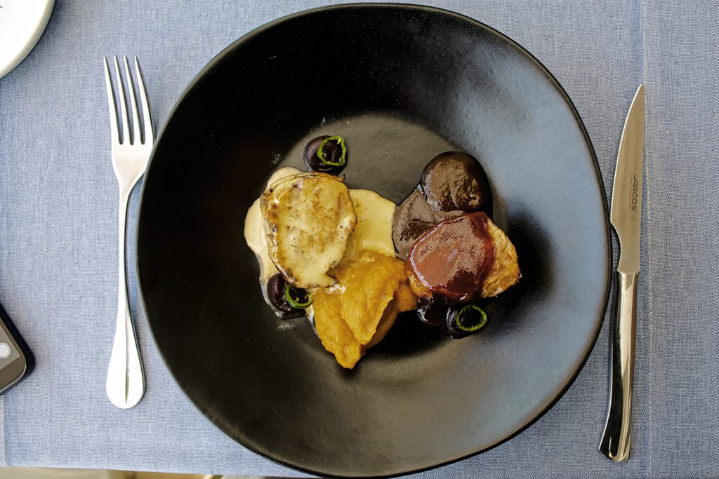 Bichillo de cerdo negro asado, holandesa de chorizo palmero ahumado, batata y mojo dulce de guayaba