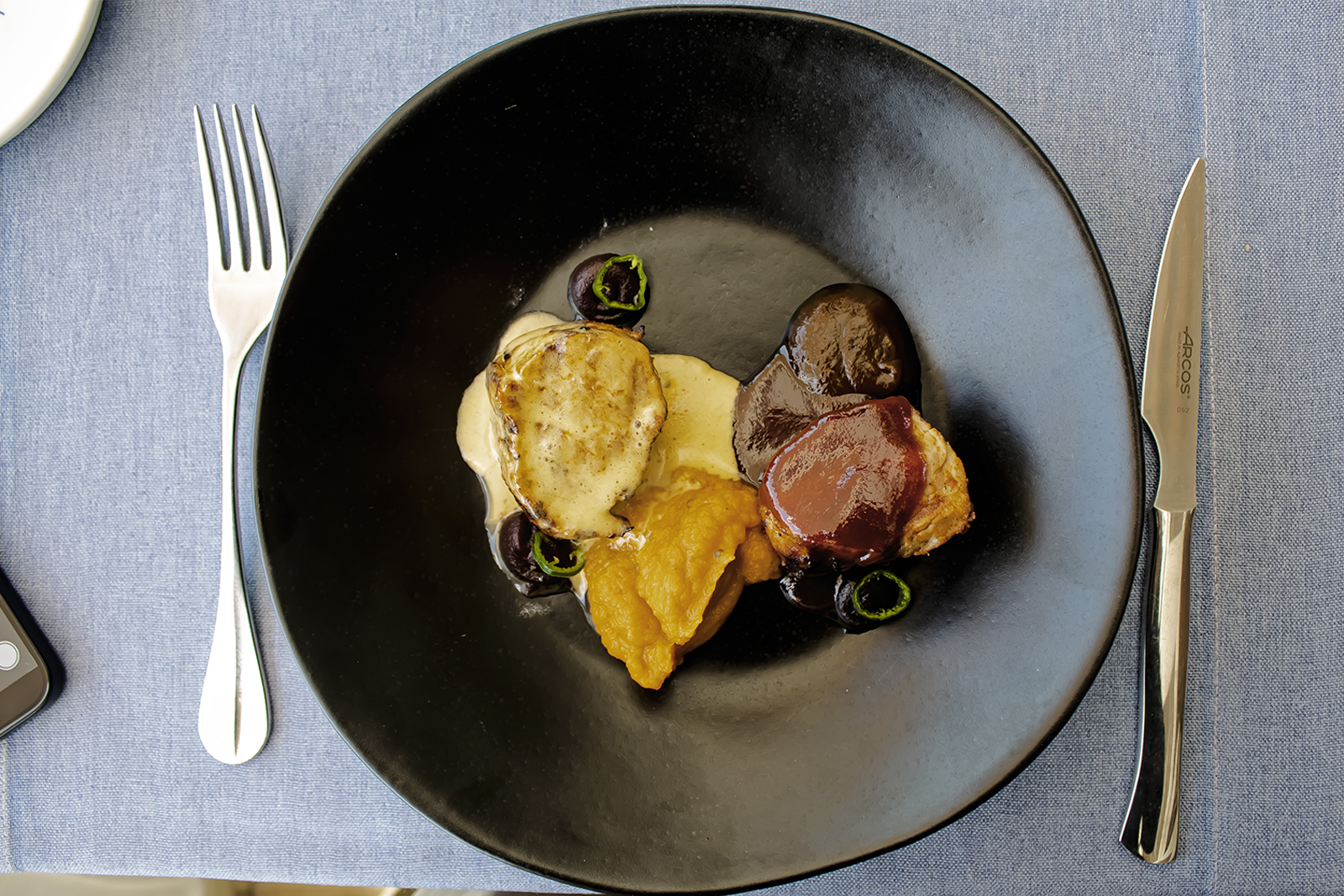 Estamos ante un plato bien pensado, donde las combinaciones están lejos de ser caprichosas. La anguila brilla con personalidad propia, presente de principio a fin gracias a una excelente calidad de producto y una cocción respetuosa. El mojosifón de chipotles estofados cumple su rol sin estridencias: aporta un picante sabroso, bien integrado, y ese punto ahumado tan característico, que suma sin robar protagonismo. Es una alegría en boca.