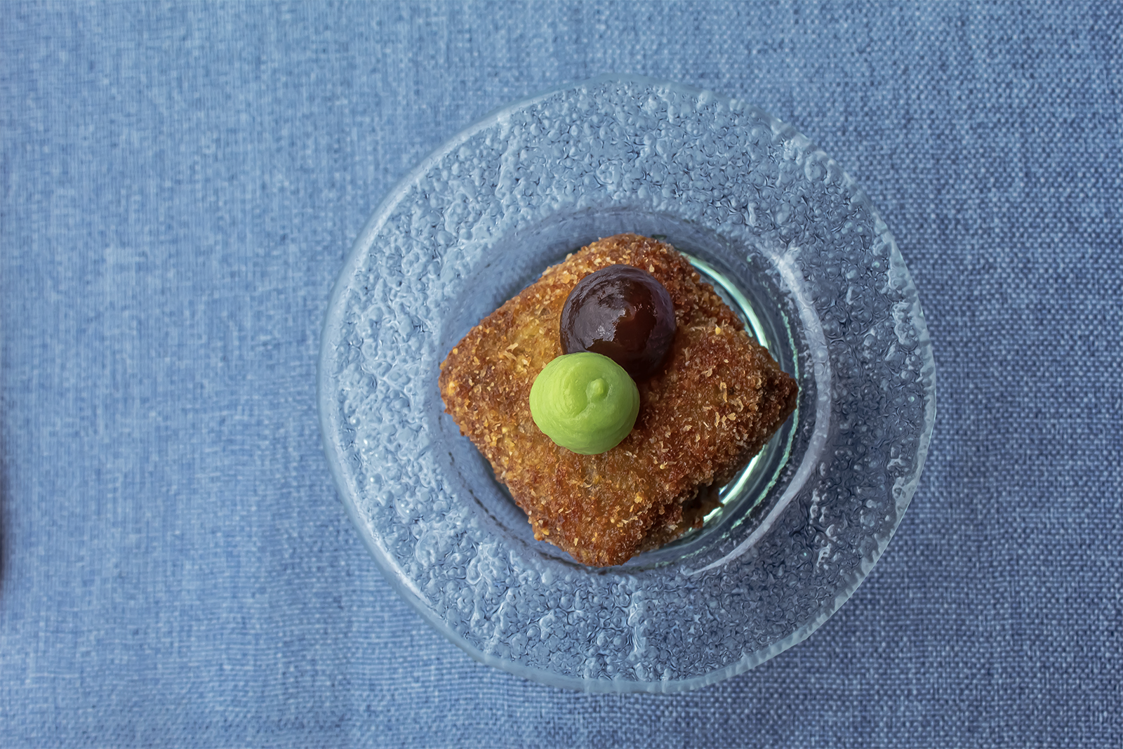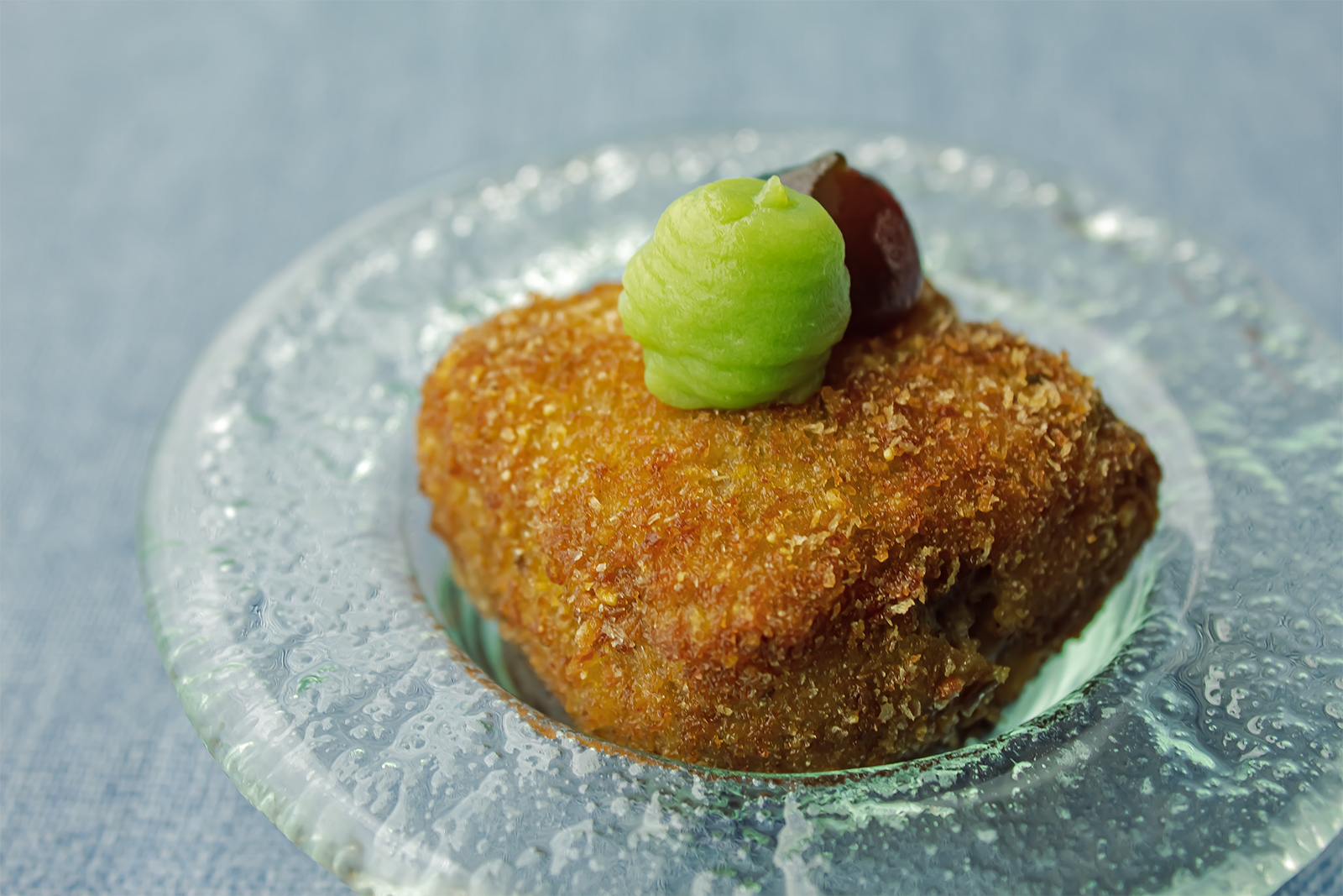 Croqueta de escaldón de grasa madurada con confitura de cebolla umami y gel de arvejas picantes