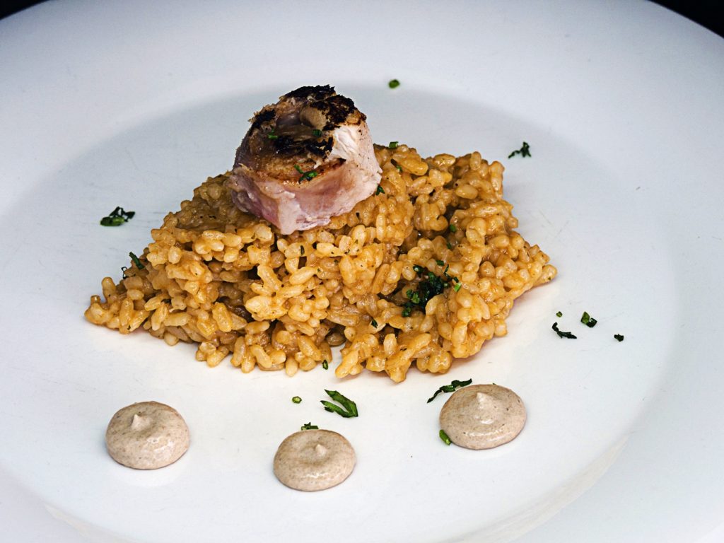 Arroz cremoso de conejo con su lomo relleno de higos y alioli de ajo negro