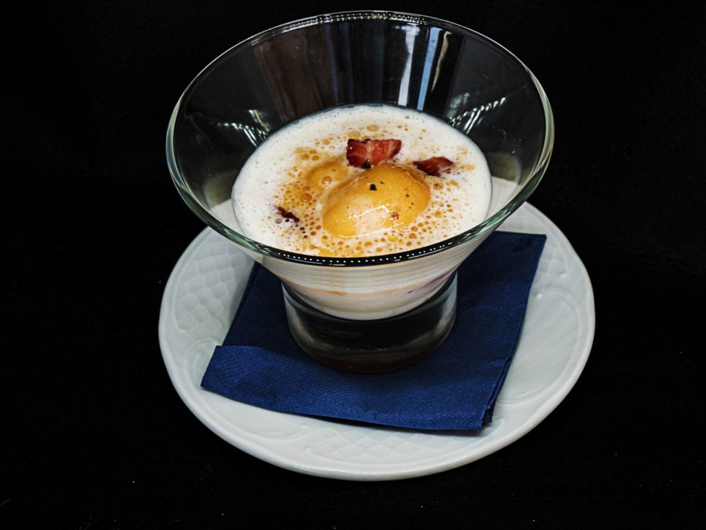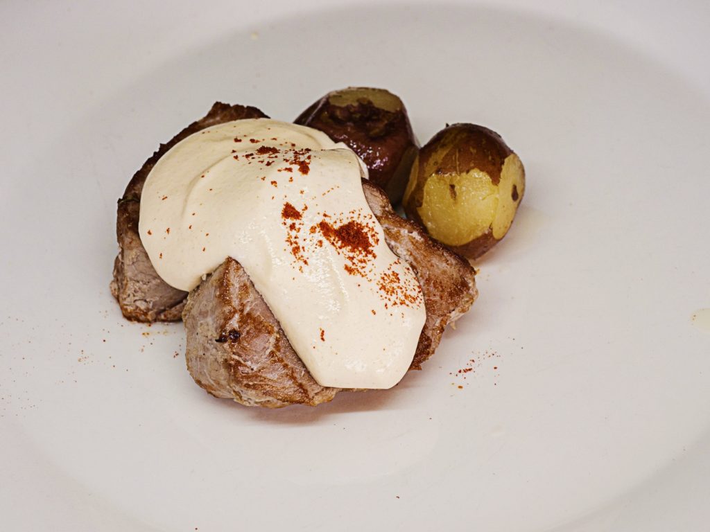 Medallón de cerdo, espuma de almogrote y papa negra confitada con especias