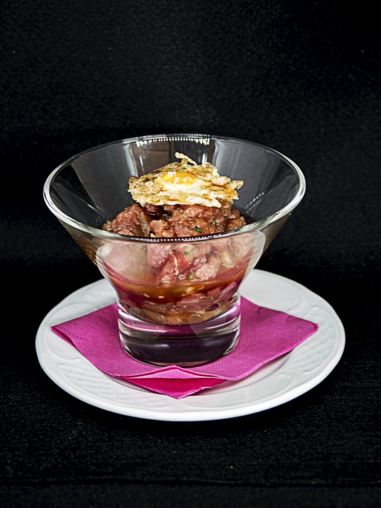 Tartar de atún, huevo de codorniz con emulsión de soja y jengibre.