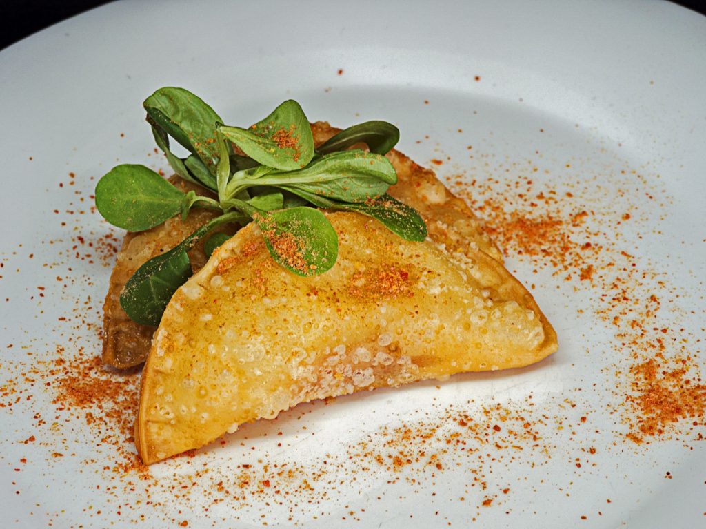 Crujiente de queso ahumado, mermelada de tomate aromatizado con caña santa