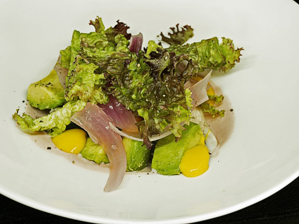 Ensalada de caballa encurtida con cítricos, mango, cebolla roja y yogur natural con remolacha