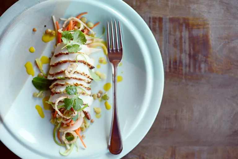 Sirve una porción de ensalada vietnamita en cada plato y coloca las láminas de calamar encima. Decora con unas hojas adicionales de cilantro y sirve inmediatamente.