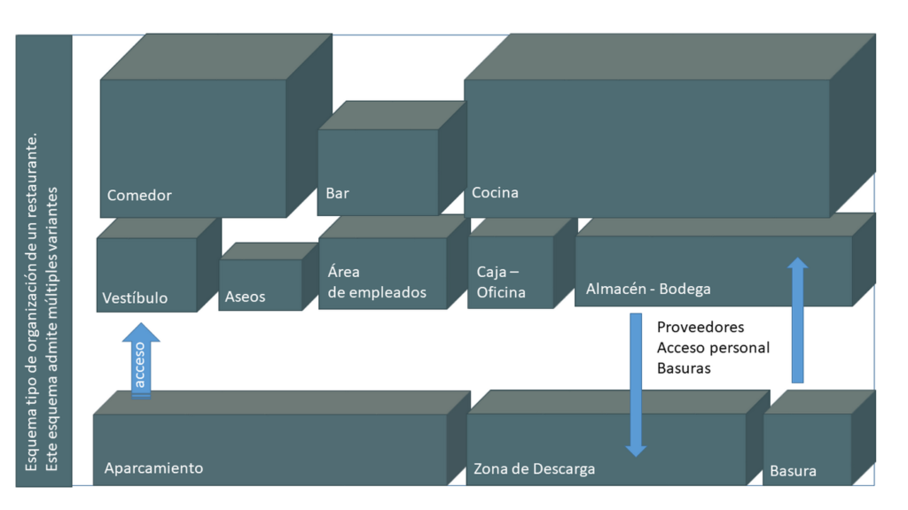 Veamos entonces cuales son las distintas zonas que conforman un restaurante y la relación que se produce entre las mismas, lo que va a condicionar donde se encuentra situada cada una de ellas.