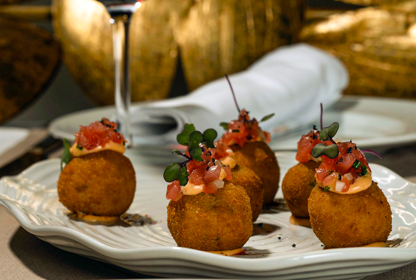 Freímos las croquetas a 170 grados hasta obtener un tono dorado. En un plato, pintamos con nuestra mayonesa de kimchee, colocamos 6 croquetas encima de la salsa para que las croquetas no “bailen” por el plato. Añadimos un poco de la mayonesa encima de cada croqueta y justo encima de ella, el tartar de atún previamente elaborado. Decoramos con algunos brotes.