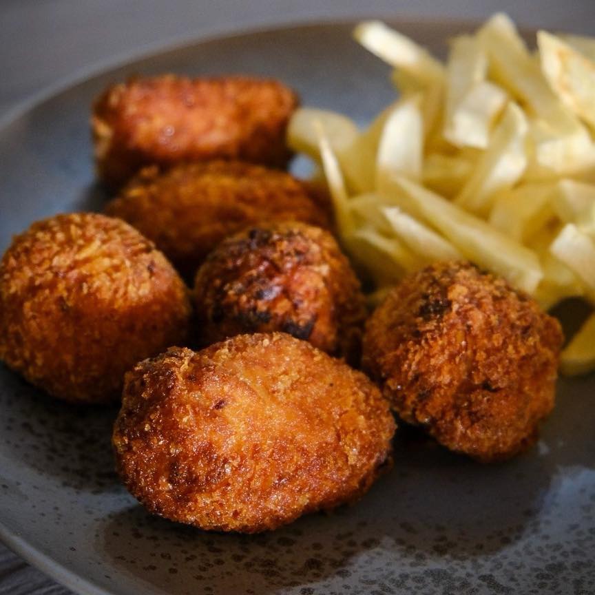 Si bien este local se ha especializado en arroces se ha ganado un sitio gracias a sus croquetas. Borja, un joven cocinero, las prepara en dos versiones: de jamón ibérico y de puerro confitado, con las que consigue brindar un bocado de gustosa combinación y un equilibrado punto en lo salado. (Imeldo Serís, 106, bajo la plaza de Weyler).