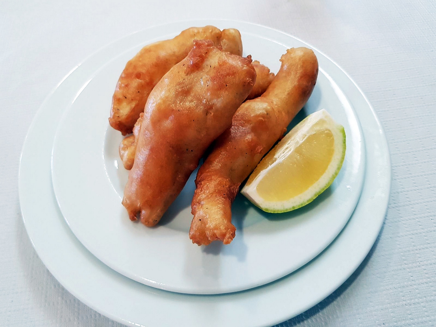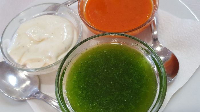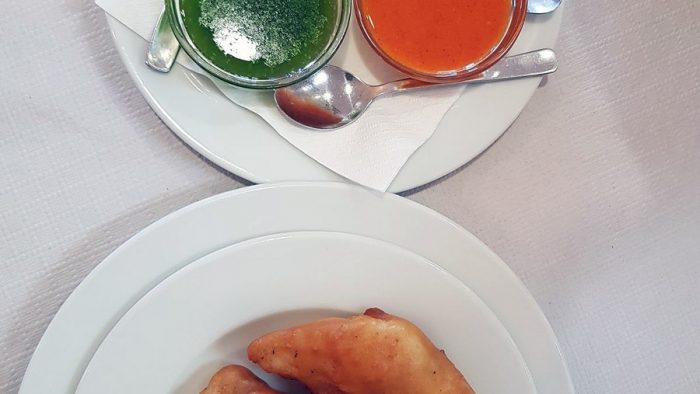 Para comenzar, lo primero que nos llega a la mesa son los Churros de pescado ¡riquísimos!. Primero los probamos sin ningún tipo de mojo… elaborados con un buen pescado fresco y un rebozado muy bien crujiente, aportando esa textura que bien se combina con el sabor de la carne del pescado; luego con el Ali–o-li y el limón lleno de buenos sabores, y un dúo de mojos verde/rojo, ambos bien ejecutados. De estos, la próxima visita pido dos raciones.
