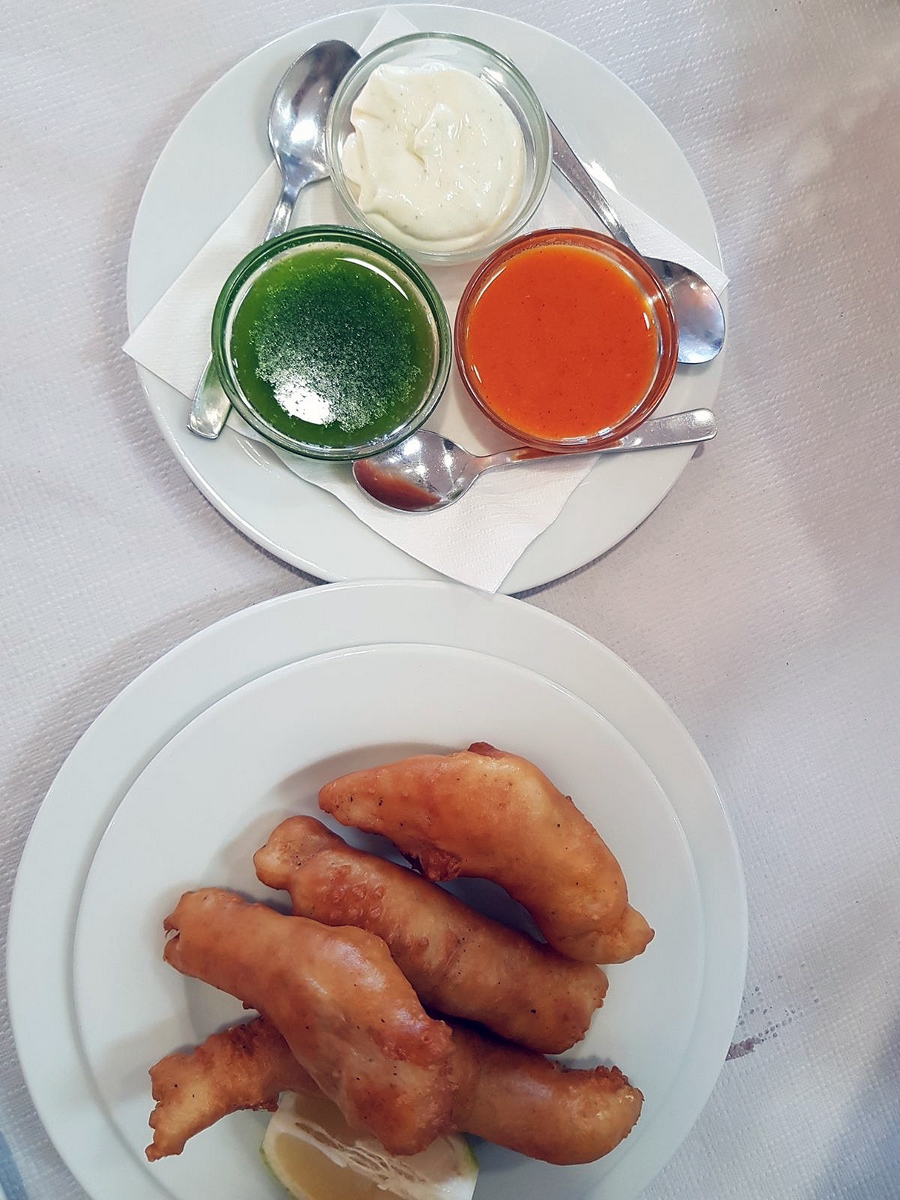Para comenzar, lo primero que nos llega a la mesa son los Churros de pescado ¡riquísimos!. Primero los probamos sin ningún tipo de mojo… elaborados con un buen pescado fresco y un rebozado muy bien crujiente, aportando esa textura que bien se combina con el sabor de la carne del pescado; luego con el Ali–o-li y el limón lleno de buenos sabores, y un dúo de mojos verde/rojo, ambos bien ejecutados. De estos, la próxima visita pido dos raciones.