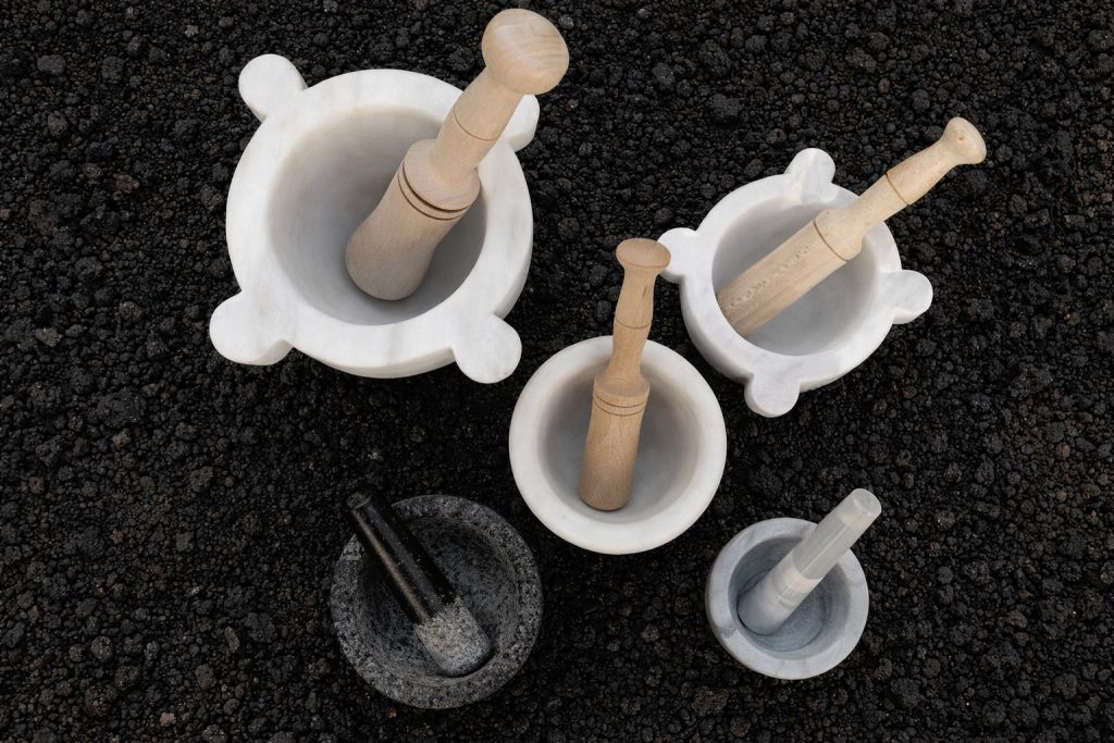 Hablar del majado es hablar también del instrumento. Piedra, mármol, madera, barro: cada material deja su huella y condiciona el resultado. Un mortero de piedra suele ser más “agresivo” y extrae aceites con facilidad; el de mármol mantiene bien la estabilidad y funciona de lujo para emulsiones; el de madera es más amable y requiere más tiempo; el de barro aporta una fricción distinta y, bien curado, se vuelve aliado para salsas delicadas.