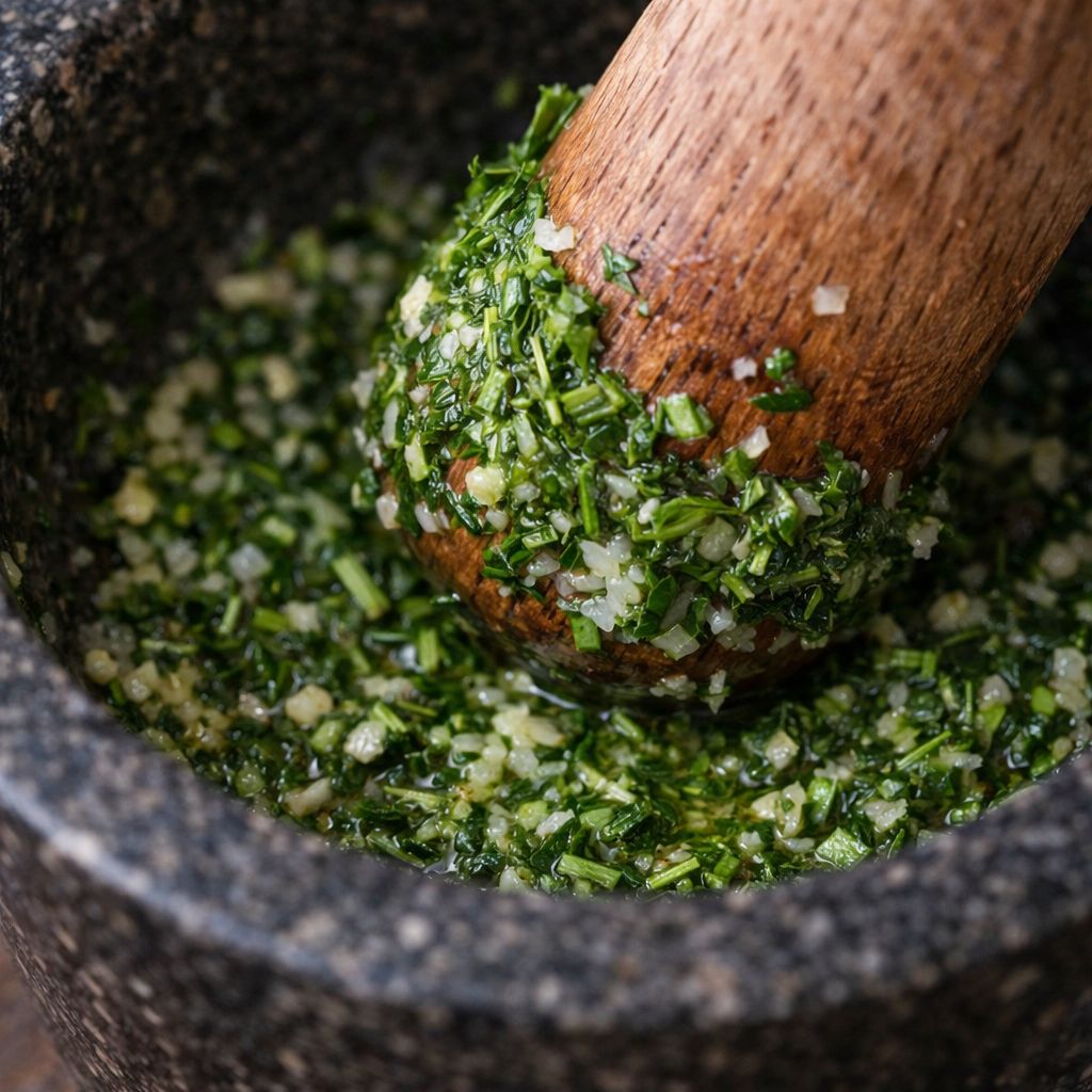 Lo que termina en el mortero no es ajo picado: es una base aromática que ya sabe a receta antes de tocar el fuego. En esa pasta conviven texturas -micropartículas de sal, hierbas desmenuzadas, pequeñas fibras- y, si se quiere, se incorporan pan, frutos secos o un toque de vinagre para dar cuerpo y dirección. La comparación más justa no es con un picado, sino con una tinta concentrada: se usa poca cantidad, pero tiñe todo el plato.