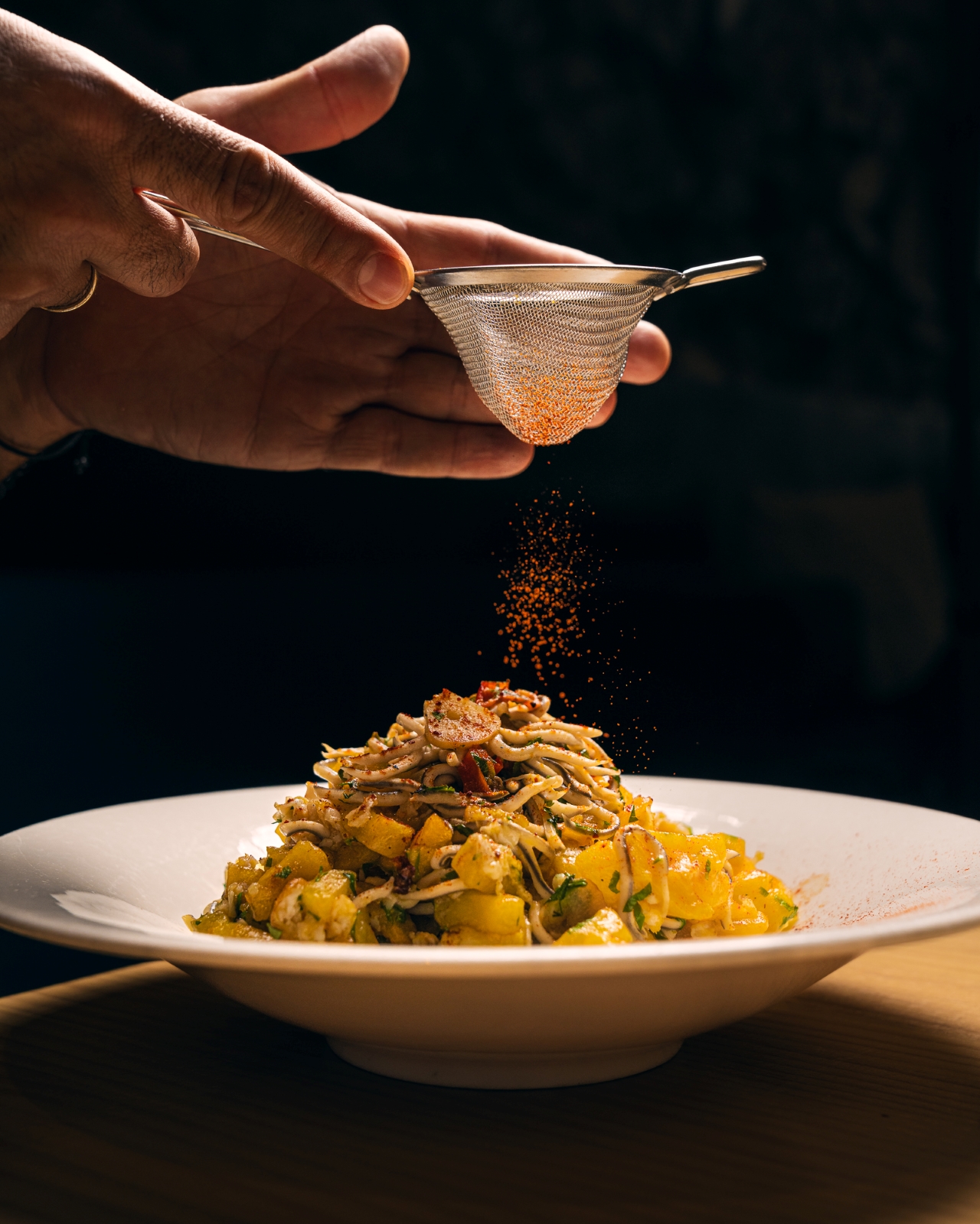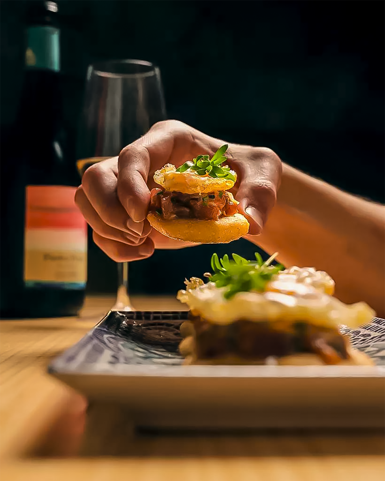 Ejemplo de cocina urbana diseñada por la diestra mano del chef Pablo Amigó, que tiene su continuidad en un cocinero como Kevin, el prólogo arranca con un divertimento en frío, una pasta para untar en forma de deliciosa mezcla de queso cremoso, tomate seco, semillas de sésamo y cebollino, que se acompaña con el descorche de un Orange de Bodega Piedra Fluida, Listán blanco de Los Frontones (Vilaflor) -los viñedos más altos de Europa-, con pase en barrica de roble y acabado en botella.