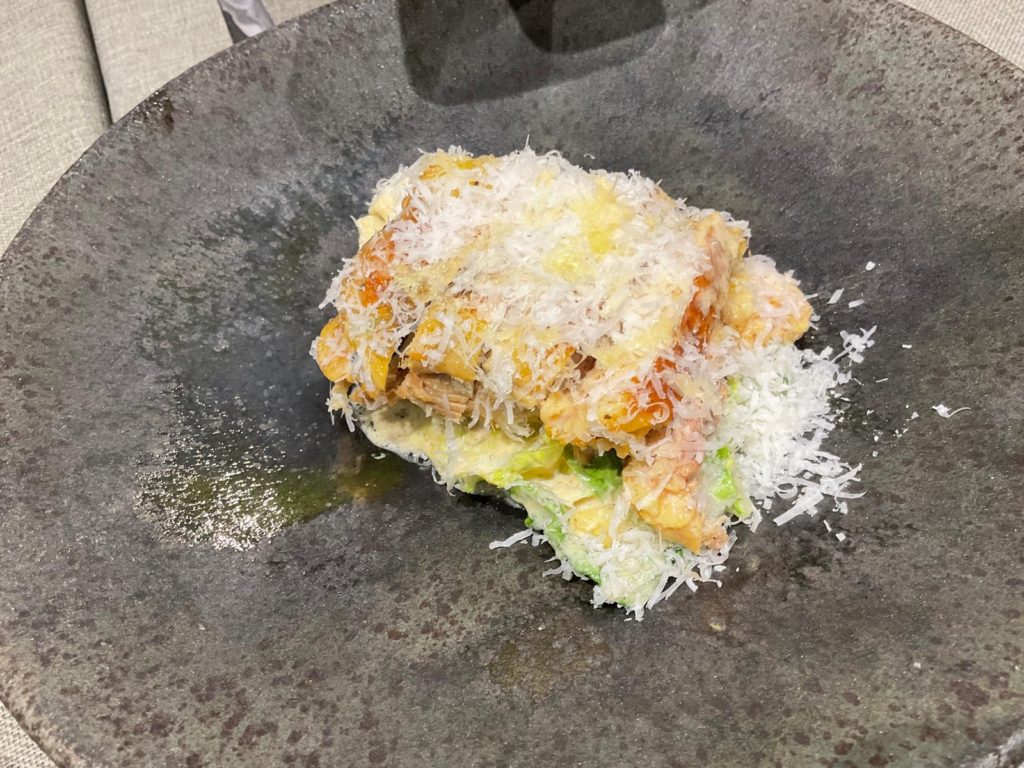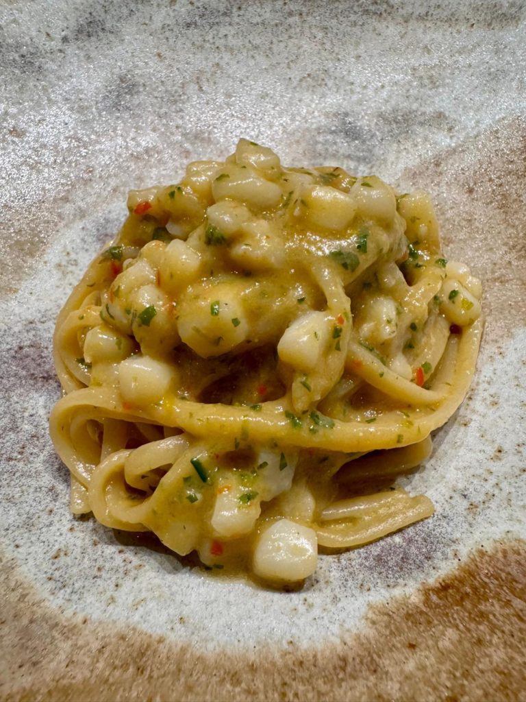 El viaje a Italia, a la cocina mediterránea, lo abre la pasta, unos linguini (originales de Liguria), con botarga (huevas de mújol) sepia, ajo y perejil, y como final dulce un babé napolitano, una masa blanda y esponjoso, que se hace jugoso en boca gracias a un almíbar de ron.