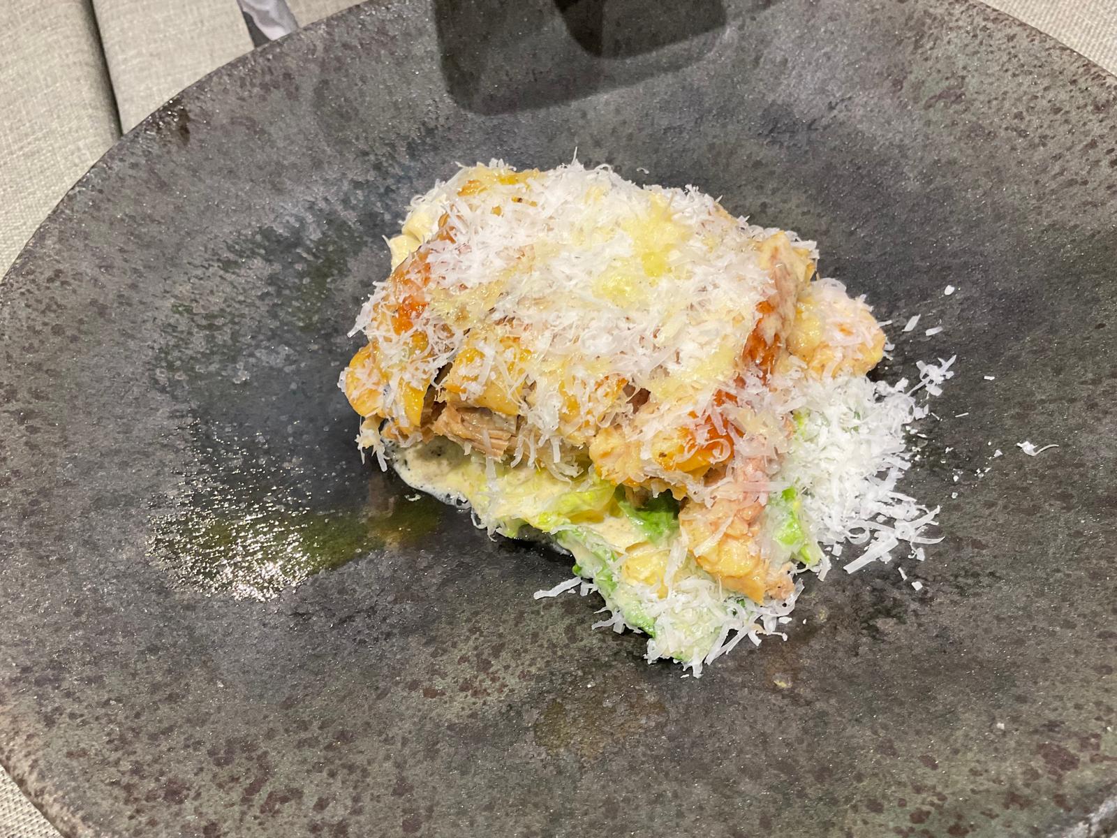 Sobre la mesa descansa una botella de Los Frontones, un listán blanco de altura muy goloso y frutal, que marida una particular interpretación de la universal ensalada César. La salsa se prepara a mano en un bol, añadiéndole cogollos y una pularda confitada con trufa, más un queso de Finca de Uga para rematar el conjunto.