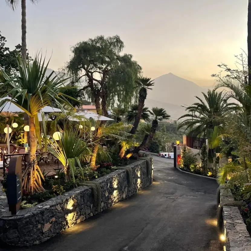 Cualquier rincon es capaz por sí mismo de atraer la atención: ese interior en tonos cálidos con un mobiliario bien distribuido que sugiere descanso y cierto placer hedonista; el porche, desde el que con un simple giro de cabeza los ojos se llenan con la imponente silueta del Teide o se bañan acantilado abajo en el azul del mar, y ese canto a la vida que representan unos jardines de ensueño con ejemplares de gran porte (palmeras, dragos) y otras especies que tiñen de un plácido verdor este espacio natural, situado en una vía de nombre Acentejo, paralela a la autopista, mientras por encima de ella, atarjeas arriba y camino de la cumbre se disemina el territorio de los guachinches.