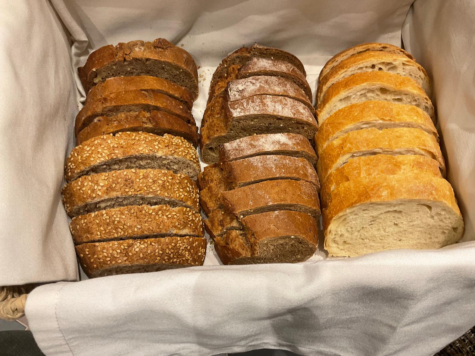 De inicio, un servicio variado de panes exclusivos para esta casa: trilogía de gofio, espelta y nueces, acomodados en una coqueta cesta y escoltados por un aceite extra virgen de mezcla picual y arbequina que prepara el paladar y el estómago del comensal.