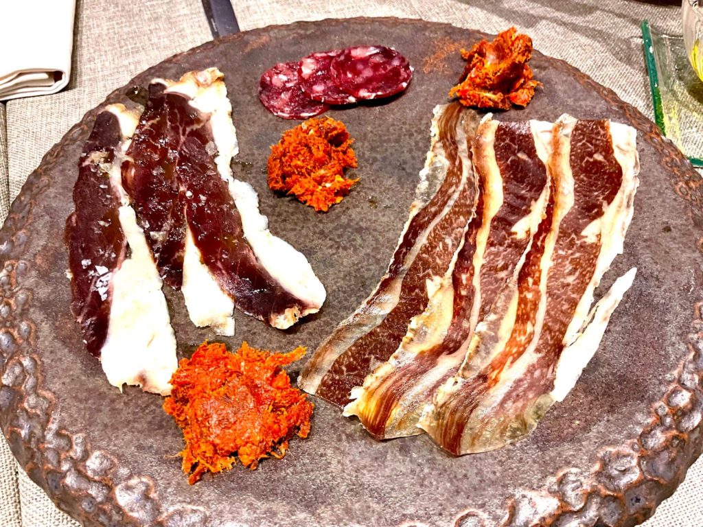 La propuesta de maridaje, Magec 2023 de Bodegas Piedra Fluida, tinto ligero 50% listán negro de Santa Úrsula y otro 50% listán blanco de Los Frontones, acompaña un aperitivo que sorprende: tabla con embutidos de vaca (panceta, salchichón, sobrasada), bien curados, de sabroso paladar e intensidad gradual.