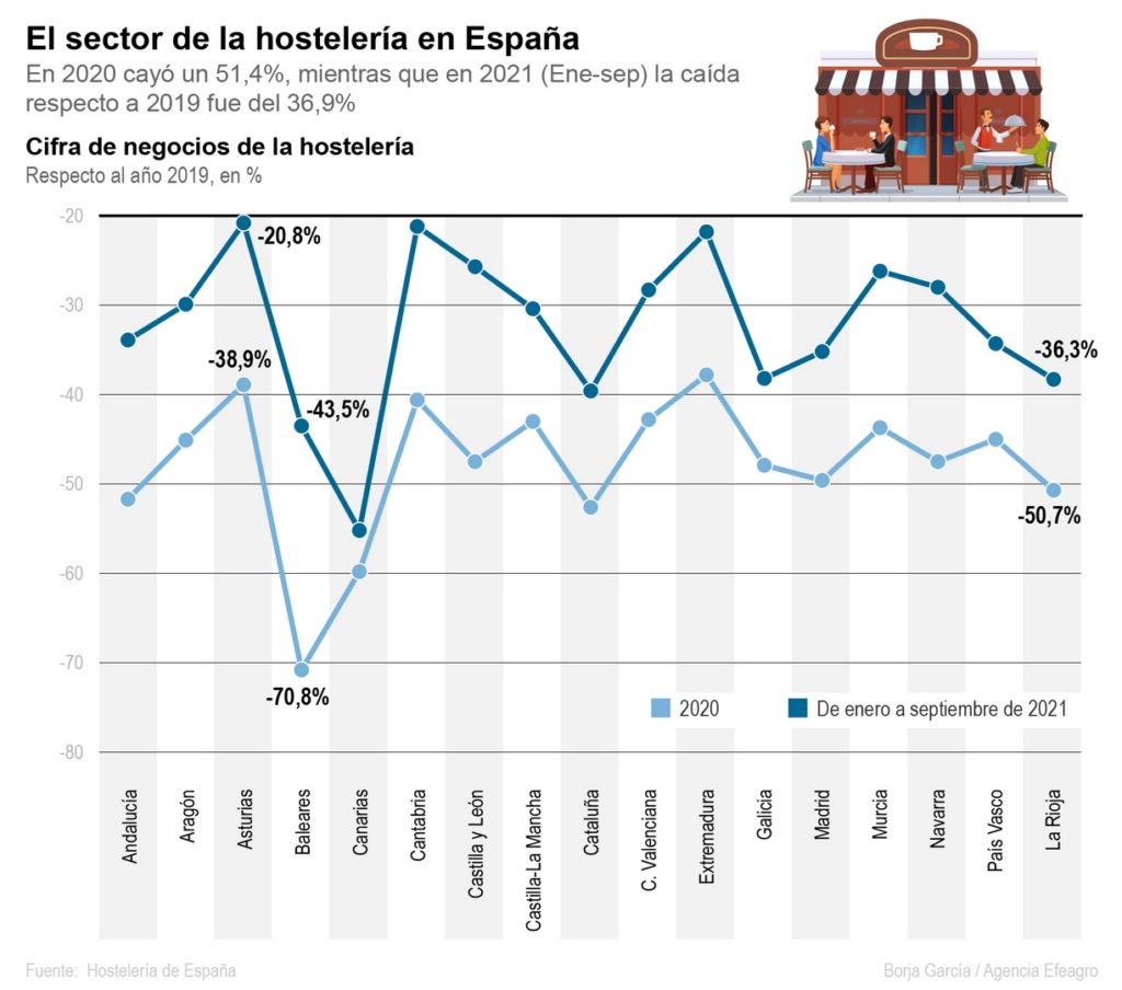 Sólo un año antes, en 2019 el área de actividad que aglutina a restaurantes y alojamientos había facturado 130.841 millones de euros, lo que suponía el 8,5 % del Producto Interior Bruto de España.