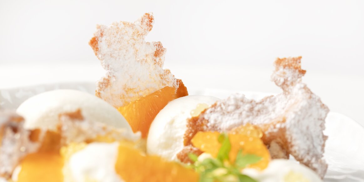 Explosivo en sabor el ‘Carpaccio di Gamberi Rossi’. Carabineros, vinagreta de maracuyá y helado de té koicha. Un juego de texturas, sabor y acidez.