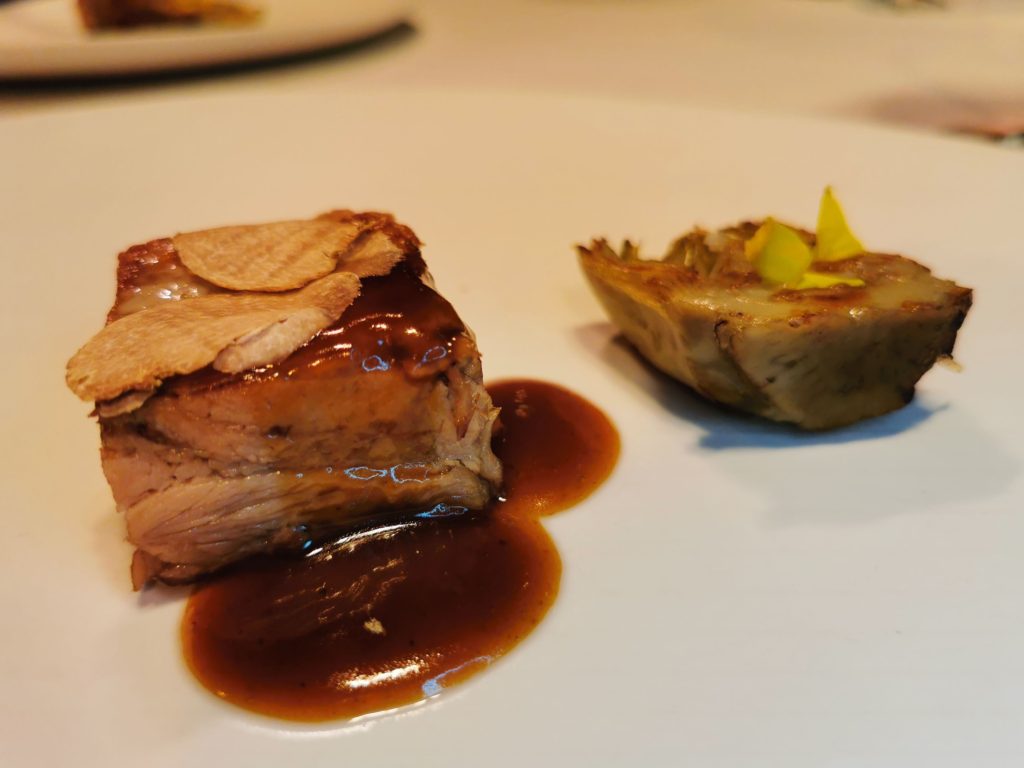 Destaca también del menú el prensado de cordero lechal “abbacchio” con reducción de miel de eucaliptus de Tenerife y corazón de alcachofa con sal maldón que despierta verdaderas emociones al paladar. Menos sorprendente la coliflor asada con pulpo al que habría que darle un repaso. Correcta la flor de calabaza tempurizada rellena de stracciatella y anchoas. Y acertado la kambucha a doble fermentación aromatizada con yuzu, piña y hoja santa, para limpiar el paladar y dar entrada a la proteína.