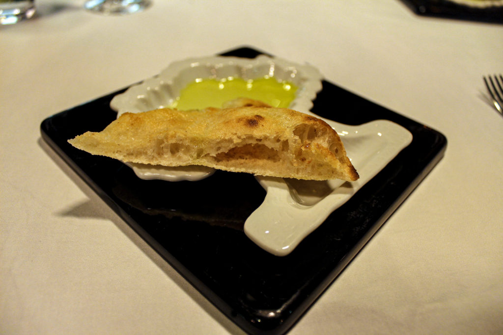 120 horas de fermentación, cocida a horno de leña y en su versión más genuina y tradicional. Deja como resultado una textura crocante en su exterior con residuos de su paso por fuego directo -pero tierna y fresca en su interior- desnuda en conocimiento de una técnica impecable, el chef la presenta simplemente con un aderezo de sal y aceite de oliva ecológico de Córdoba ‘Rincón Bubetica’, galardonado como el ‘Mejor Aceite Ecológico del Mundo’ y con el que completa la paleta de sabores.