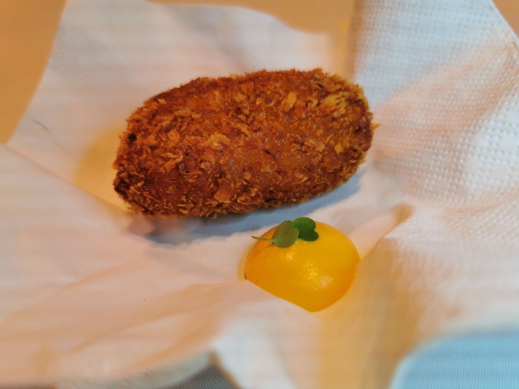 A la mesa llega un plato que nos habla de los orígenes del Chef. Un ‘supplì de bolognesa’. Hablamos de un tipo de croqueta italiana, preparada al estilo risotto -es este caso de orzo- que se corona con la salsa típica de su región en la que destaca el toque de zanahoria ahumada. Aquí el crujiente y el sabor, juegan con tu paladar.