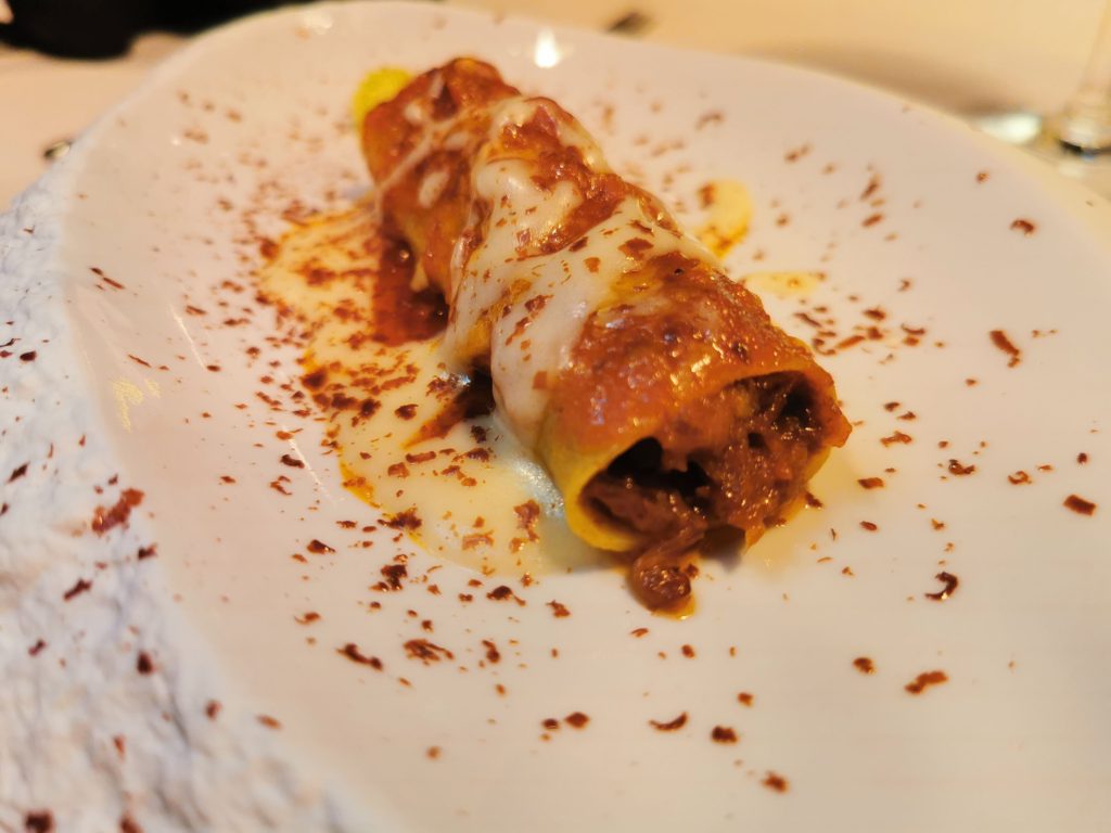 Así que, para afianzar la intención del chef en representar su fuerte vínculo con la tradición y origen, los ‘canelones a la vaccinare’; rellenos de rabo de toro, bechamel de pecorino y chocolate rallado; hacen que el menú llegue a su ‘punto cúspide’. El guiso de rabo de toro, con una ‘textura casi de mantequilla’ y una gran concentración de sabores, deja ver la hidratación de líquidos y horas de cocción que ha llevado. Una propuesta sosegada, sin sobresaltos ni sorpresas en el momento culminante de metérsela en la boca. Es difícil resistirse a la tentación de rebañar el plato.