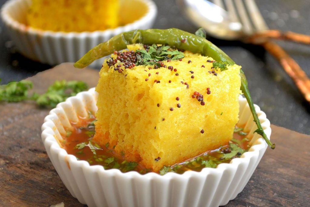 Este es un bocadillo popular de Gujarat, hecho de una masa de harina de garbanzo fermentada. Se cuece al vapor y se sirve con chutney de cilantro y tamarindo. Es ligero, esponjoso y perfecto como merienda o aperitivo.