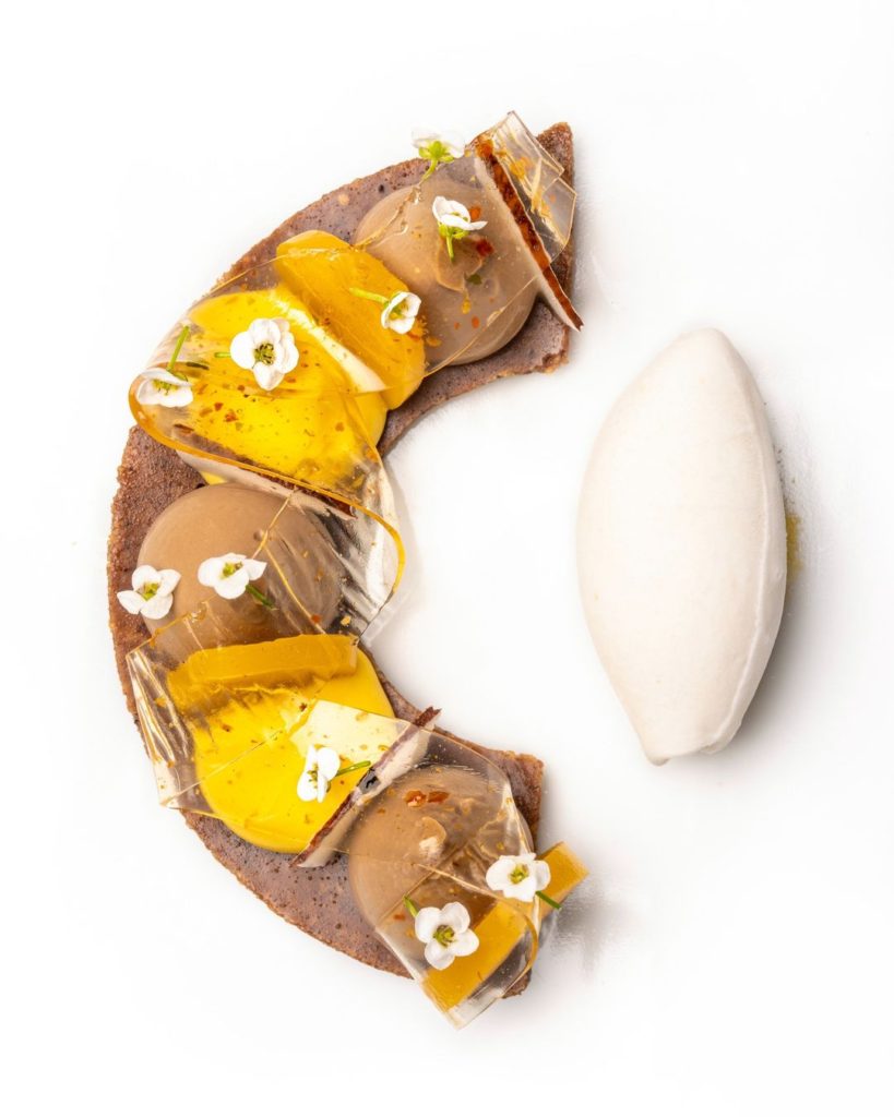 Tuile de jengibre y canela con batata de Lanzarote, cilantro y miso. Este pequeño manjar se coloca sobre un tuile, una especie de galleta al estilo francés, pero con un giro propio. Jesús la elabora con batata de Lanzarote, mojo y una mayonesa de miso. Aquí, su experiencia pastelera se combina con elementos salados, creando una experiencia única.