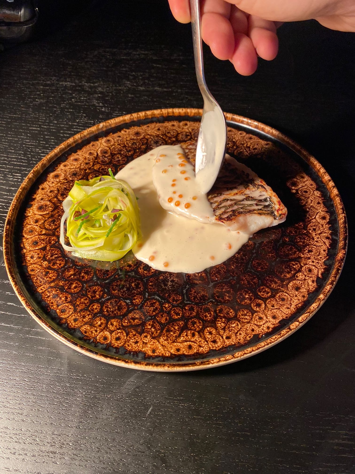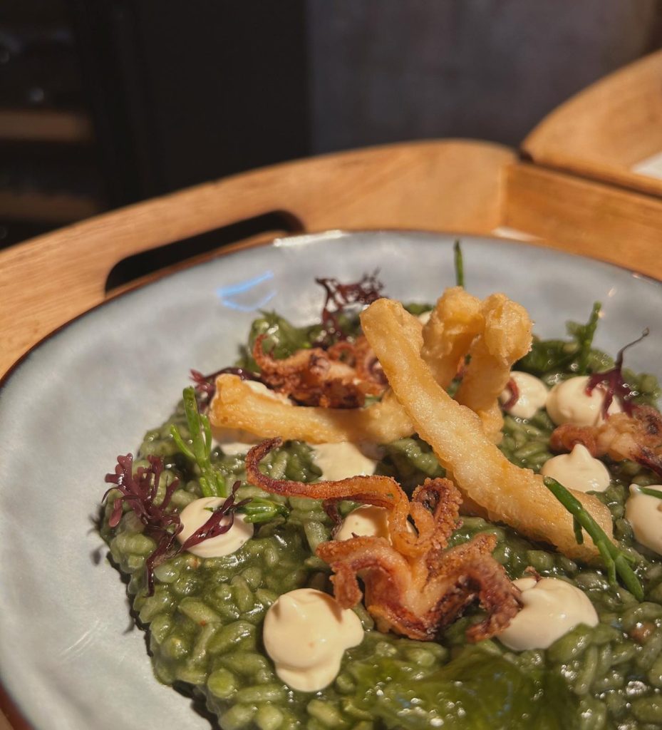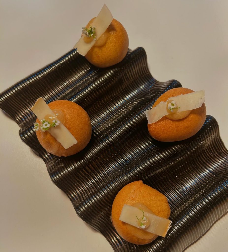 La experiencia gastronómica en La Catedral Bistró comienza con un aperitivo de la casa que es toda una declaración de intenciones: un puerro a la brasa con salsa de miso jengibre y sésamo. Esta combinación de sabores dulces, picantes y salados es una explosión de sabor que despierta los sentidos y prepara el paladar para lo que está por venir. A continuación, una croqueta de guiso de carne de cabra con mahonesa casera de kimchi, una combinación perfecta de tradición canaria y exotismo coreano. La cremosidad del guiso de cabra se funde con el toque picante y fermentado del kimchi, creando una experiencia única y sorprendente.