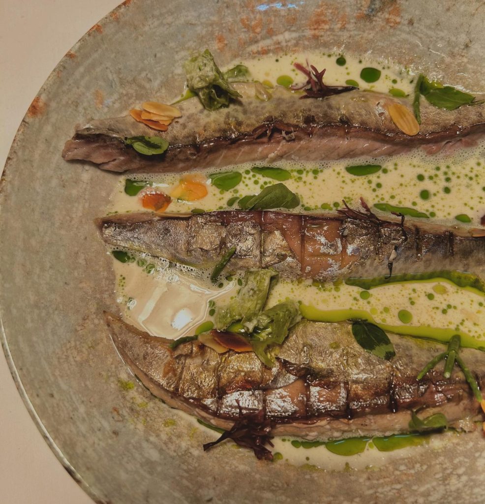 El menú continúa con un surtido de Setas a la brasa de variedades mixtas sobre un huevo escalfado. Este plato es un homenaje a la temporada de setas. La yema del huevo escalfado, al mezclarse con las setas, crea una salsa cremosa y deliciosa que invita a mojar pan sin parar.