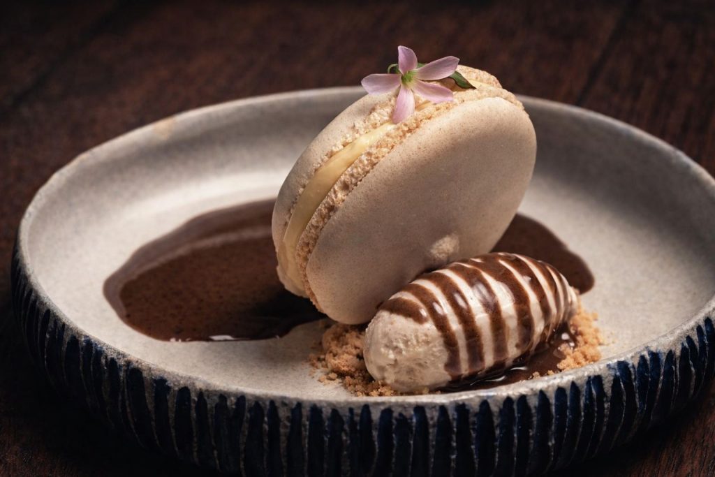 El acto final ocurre en el plato. Fondo una salsa de chocolate negro, oscura y brillante como el azabache. Trazo una línea firme, coloco el macaron relleno de esa crema verde pálida y, a su lado, una quenelle perfecta de mi helado de chai.