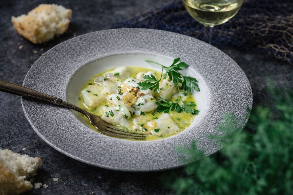 Su Kokotxa es elegante, blanca, de una suavidad que casi se deshace. Pero no es la única. El bacalao ofrece una versión más rústica y poderosa; su piel es más gruesa y suelta una cantidad de gelatina casi insultante, lo que facilita enormemente el ligado de la salsa.