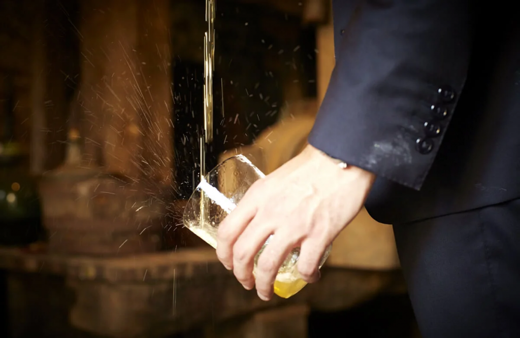 Si algo define a la sidra asturiana es su peculiar ritual de servicio. El escanciado, ese gesto emblemático que requiere elevar la botella con un brazo firme y verter el líquido contra el borde del vaso de fino cristal, permite liberar aromas y potenciar su sabor. Cada culín, servido en dosis exactas, debe ser bebido de inmediato para conservar sus propiedades. Más que un acto, es un arte.