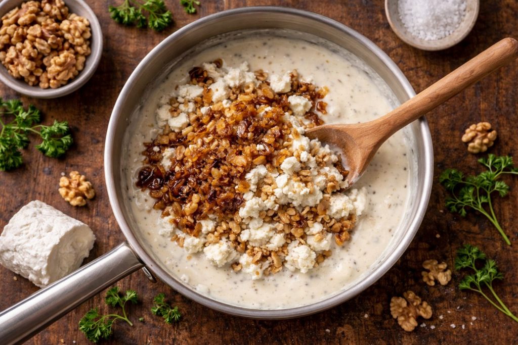 Incorpora la cebolla caramelizada, la mezcla de queso y nueces a la bechamel. Mezcla bien hasta que quede una masa homogénea. Añade sal y pimienta al gusto. Cocina 2-3 minutos más para que los sabores se integren.